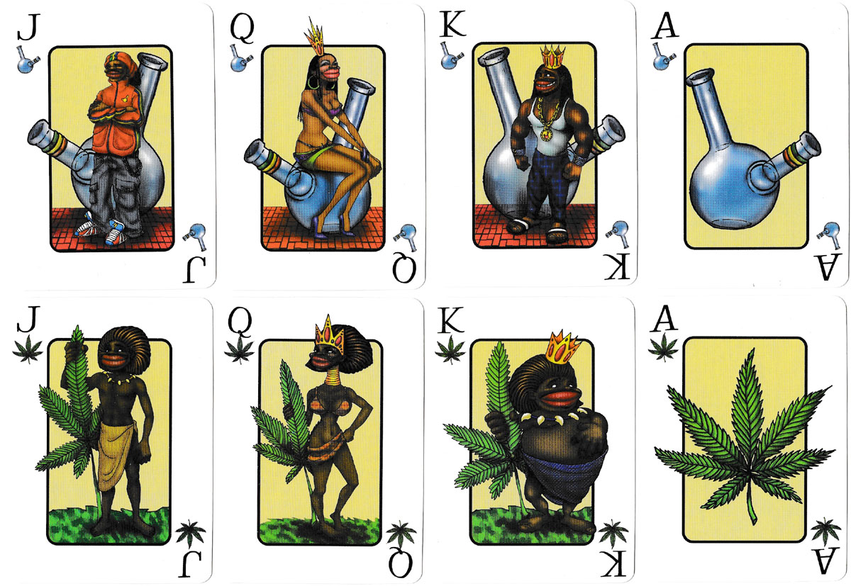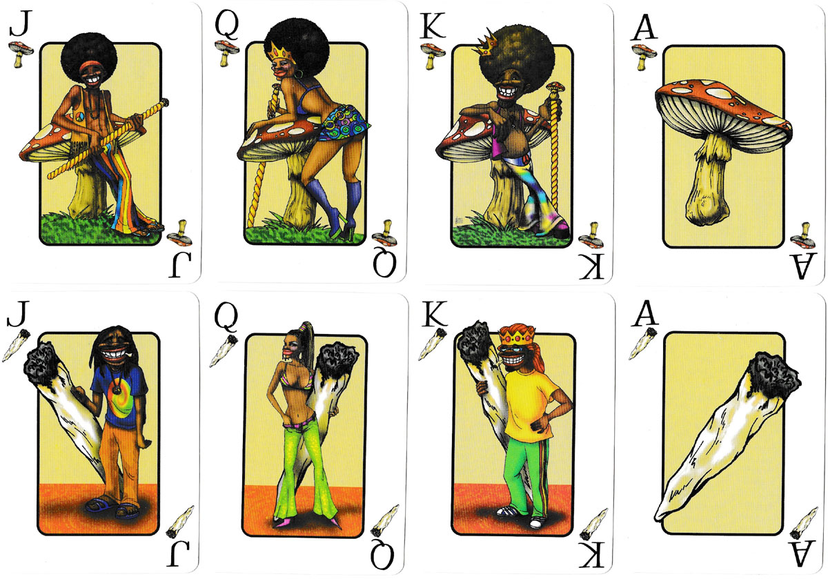 These delightful and quirky cards were made in 2002 by Heraclio Fournier and they celebrate the Rastafari religion. Instead of the traditional suits the pack features marijuana joints, bongs, cannabis leaves and the hallucinogenic amanita muscaria mushrooms. The court cards appear to hark back to the 1960s and 1970s when Rastafari gained increased respectability within Jamaica and greater visibility abroad through the popularity of Rasta-inspired reggae musicians like Bob Marley. See the box►