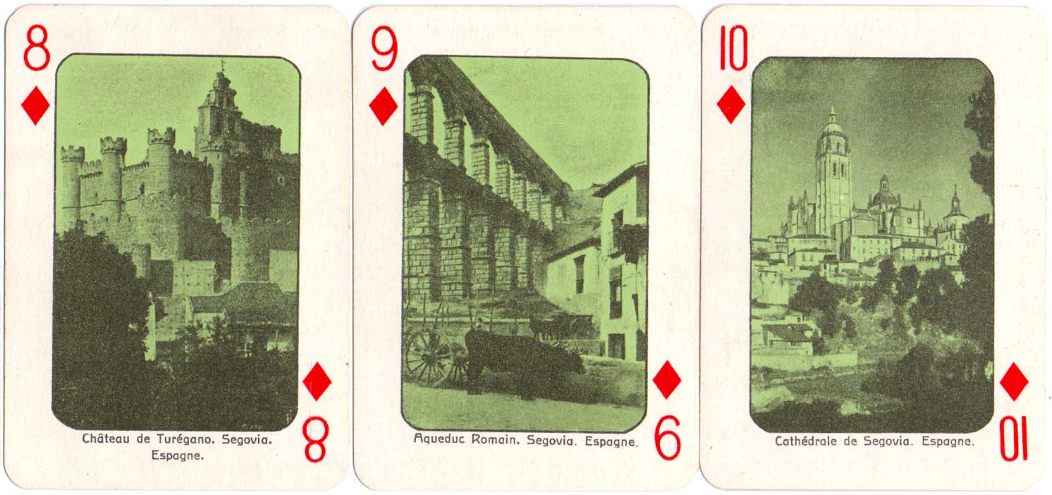 Printed by Hijos de Heraclio Fournier, Vitoria, published by Patronato Nacional de Turismo for the French-speaking tourist market. 52 cards + joker in mock snakeskin box. The photographs are tinted in different colours for each suit. The four of clubs has the exportation tax stamp which was used from c.1932. This tax stamp and the reverse shows the mural crown and the legend "Républica Española" along with medieval buildings. At this time Spain had fallen behind in terms of progress and modernisation was an important objective. These cards present Spain as a land of rich cultural heritage full of magnificent ruins, cathedrals, castles and monuments. There are no allusions to bullfighting, flamenco or bikini-wearing women on beaches which became the popular image later on.