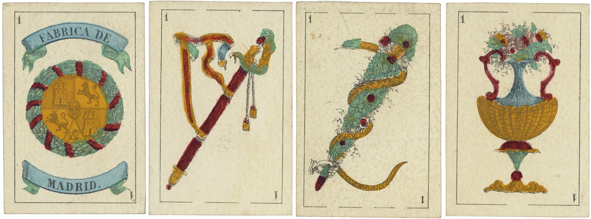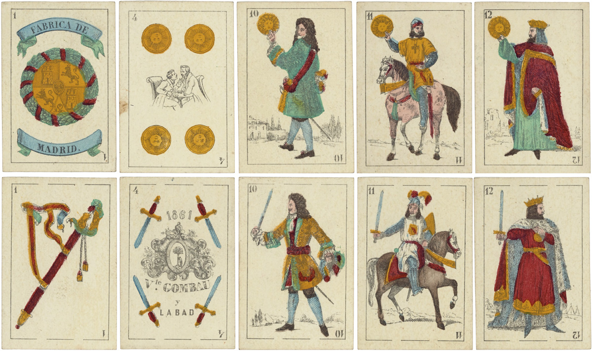 Above: non-standard Spanish-suited playing cards published by Vicente Gombau y Labad (Madrid) in 1861. Stencil-coloured lithograph, 40 cards, corner index numbers, square corners. Source gallica.bnf.fr / Bibliothèque nationale de France • Vicente Gombau et Labad (Madrid)►