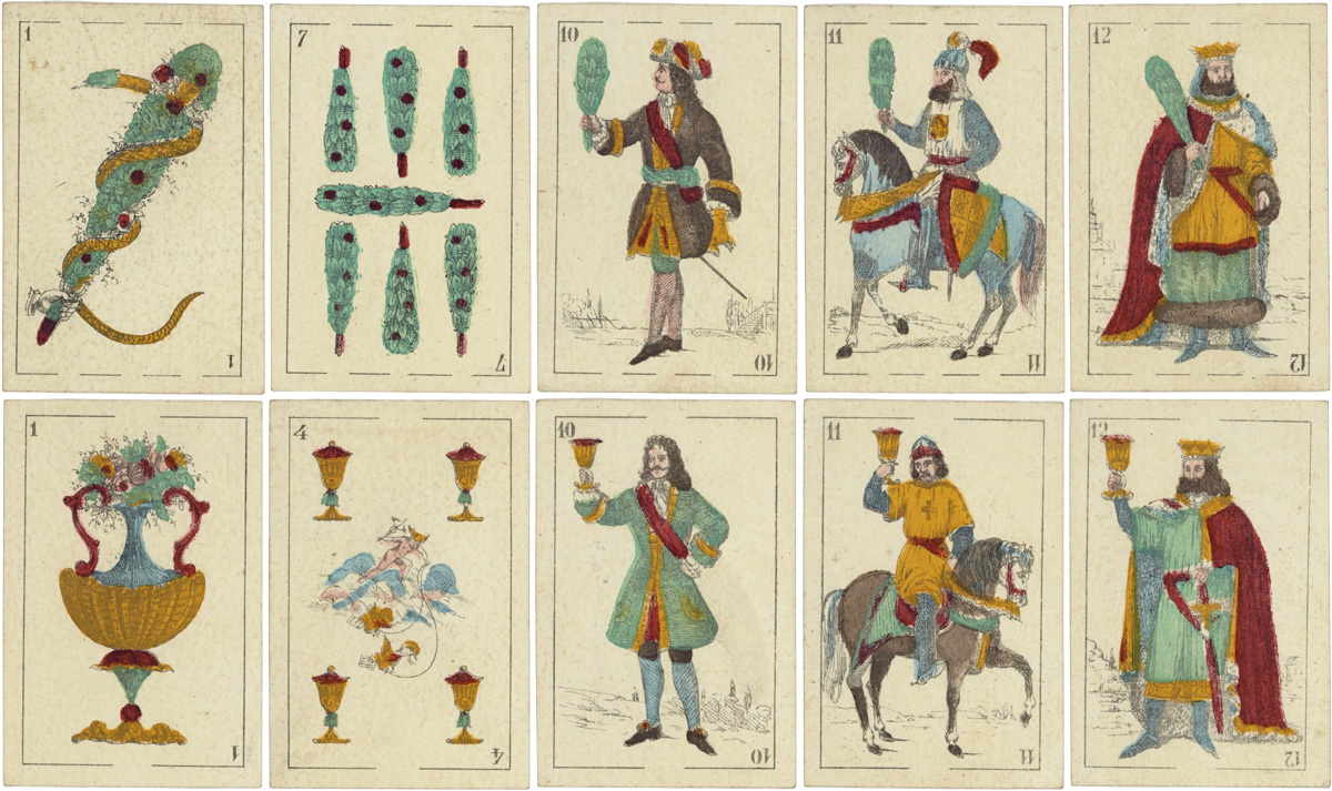 These elegant non-standard Spanish-suited playing cards were published by Vicente Gombau y Labad in Madrid. The four of swords has the date 1861 and the inscription ‘Vte Gombau y Labad’ around an elaborate device containing the coat-of-arms of the city of Madrid, a bear standing by a strawberry tree (madroño). The four cavaliers are reminiscent of medieval crusading knights. All the court cards have feintly engraved scenery in the background. See detail from four of cups • four of coins • the back►
