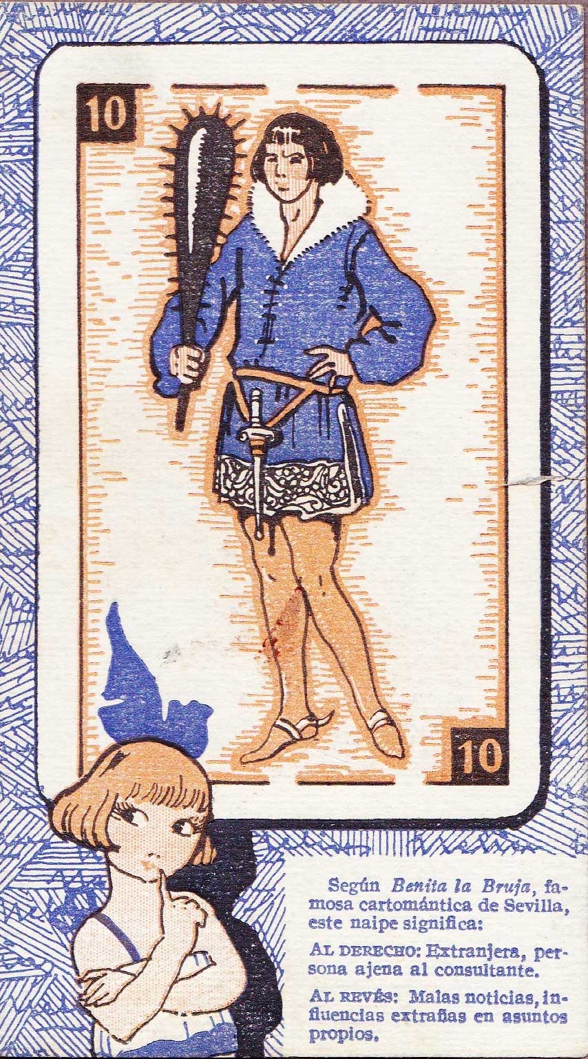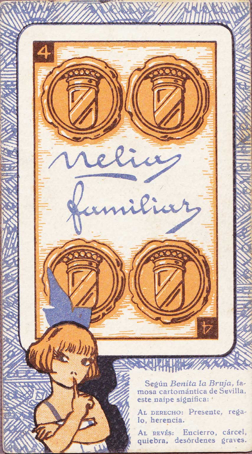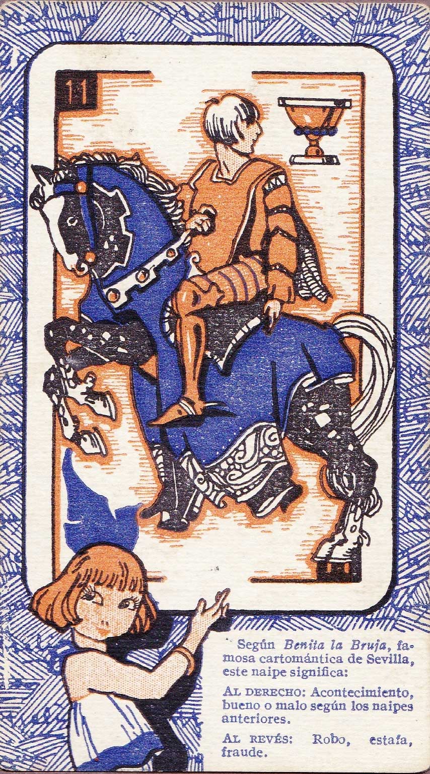 Cartomantic meanings of Spanish playing cards by Benita the Witch (XVI century), published by Chocol...