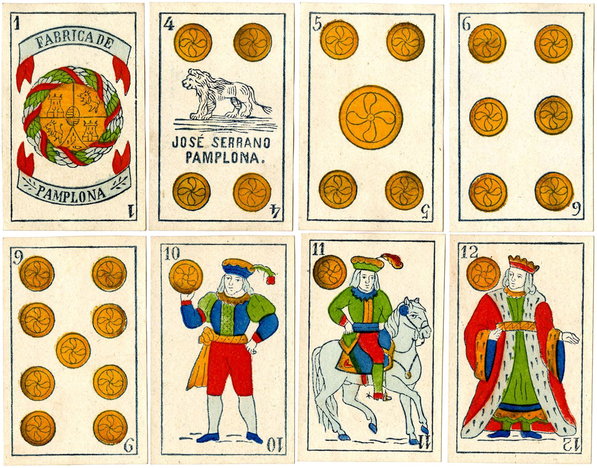 Spanish-suited playing cards in the Raimundo García pattern produced in Pamplona by José Serano, c.1875. The ace of coins has the arms of Spain with the inscription “Fabrica de Pamplona” while the maker’s name appears on the four of coins.