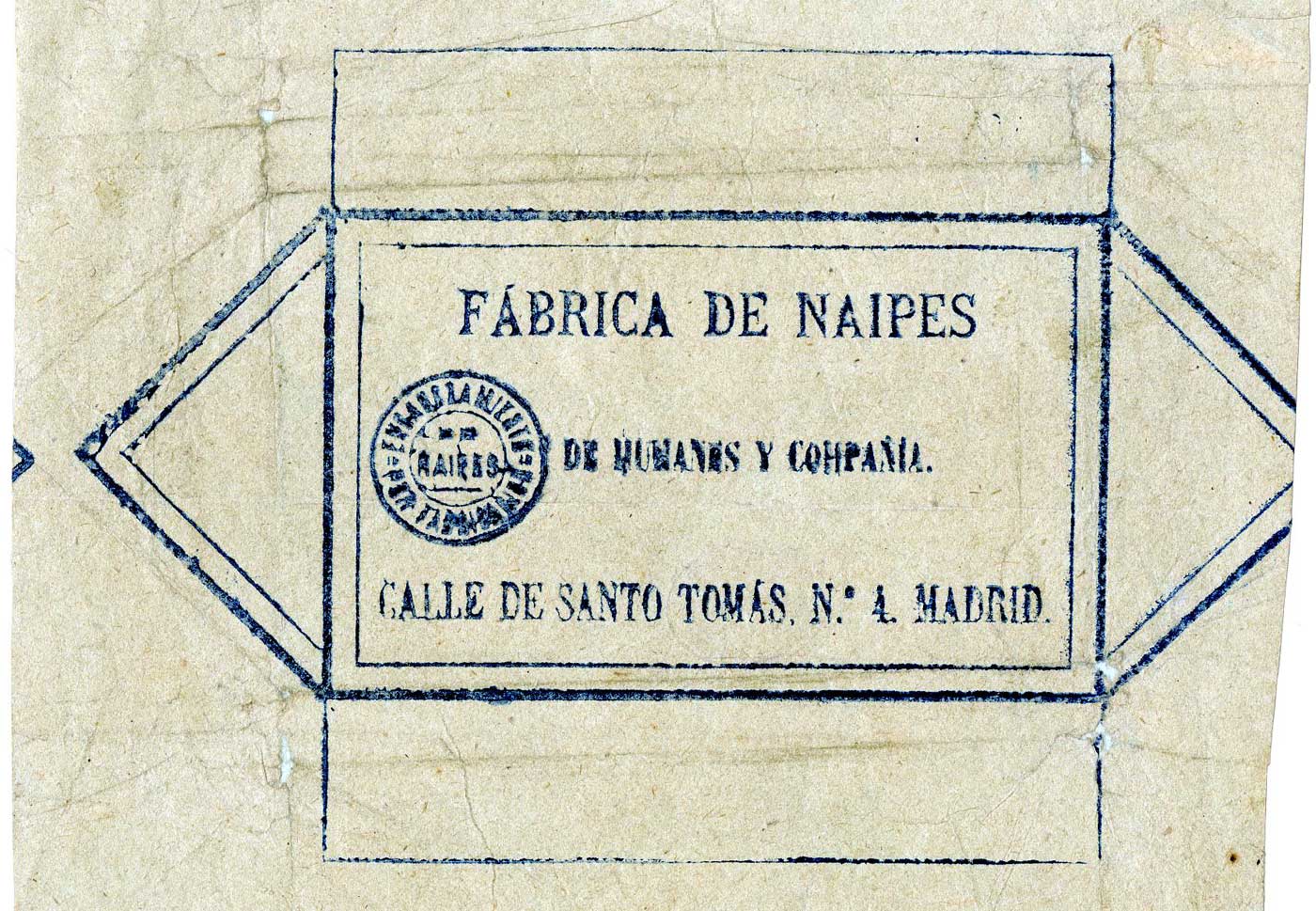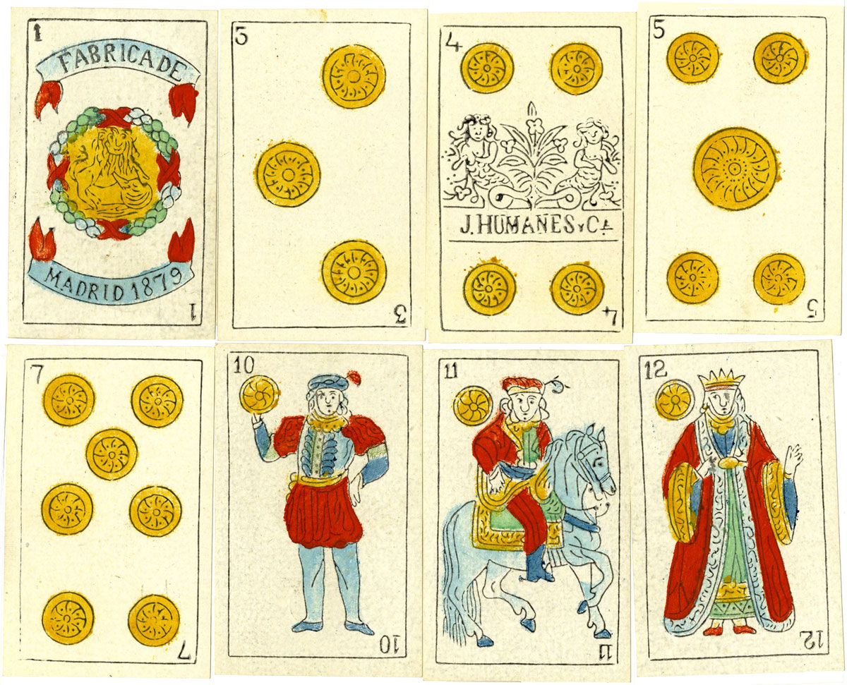 Spanish-suited deck published by Juan Humanes y Cía, Madrid, 1879, in the more rudimentary Raimundo García pattern which suggests economic constraints or maybe a budget product available at low cost. The ace of coins has a lion with a sphere and the inscription “Fabrica de Madrid 1879” and the 4 of coins “J. Humanes y C_a” beneath two mermaids. See the wrapper►