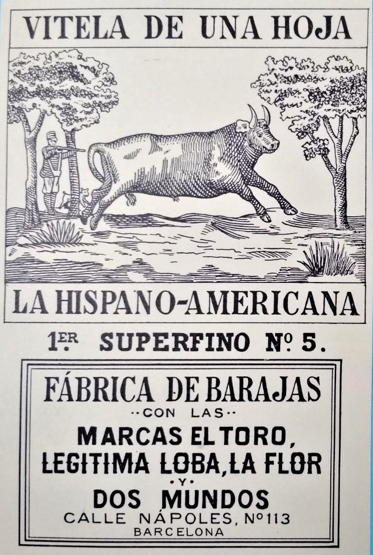After the Spanish Civil War (1936-40) only three or four Spanish playing card makers remained: Fournier, Comas and Roura. Fábrica de Barajas Juan Roura produced a range of popular standard designs, including Catalán and Castilian type packs, plus Cádiz-type models for exportation to Philippines and Latin America. Brand names include Dos Mundos, La Flor, La Hispano-Americana, La Legitima Loba, La Yegua and El Toro. Bridge / Poker decks were sometimes only given a number, such as Nº 15, 55, 305, 505, etc. Roura also produced children's card games. Juan Roura worked in Barcelona at Calle Nápoles no. 113 until acquired by Heraclio Fournier in 1962.