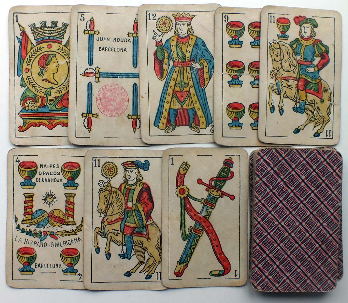 Above: cards from two examples of Catalan type "Naipes Finos de Una Hoja La Hispano-Americana", manufactured in Barcelona by Juan Roura, c.1930s. This design was used, with slight modifications, over several decades. The four of coins depicts an anchor and a caduceus, whilst the ace of coins also depicts an anchor along with a cornucopia and other emblems suggestive of maritime trade and national prosperity. The red 1.25 Pesetas tax stamp on the five of swords in both examples were used during the period c.1931-36. Roura also exported cards to South America.