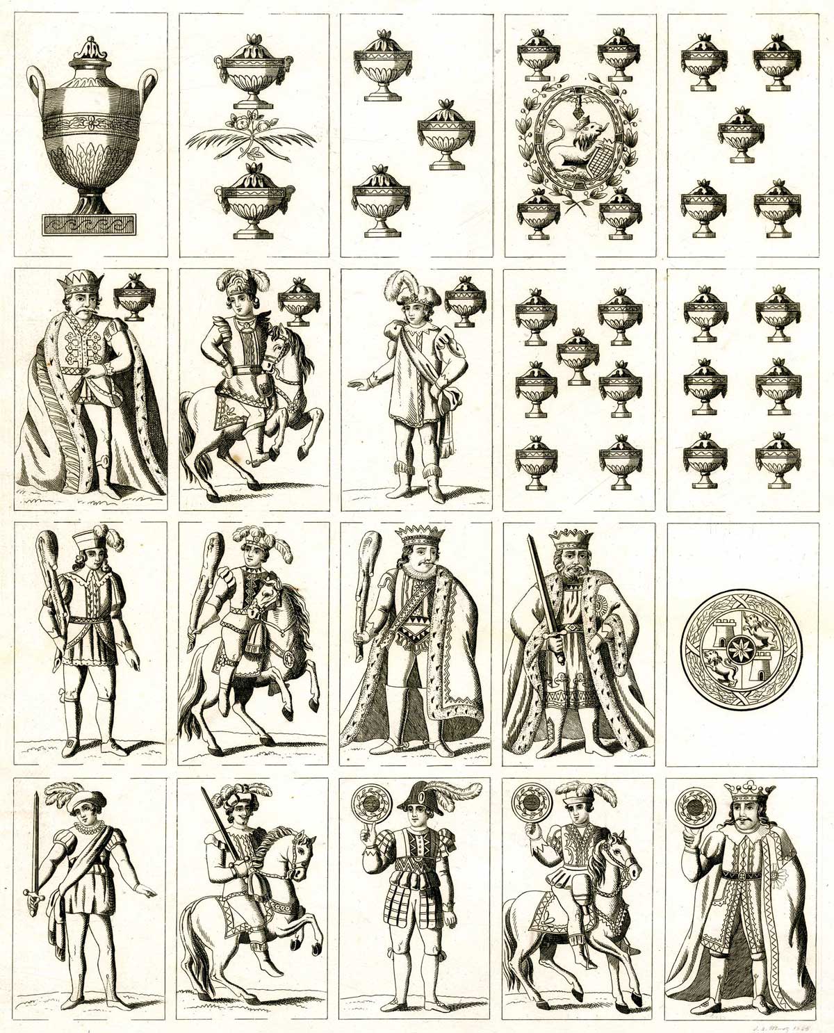 During the early 19th century several Spanish manufacturers were producing finely engraved packs (Clemente Roxas, Josef Monjardín, Martínez de Castro) and Anton Llombart was also in this group, producing several fancy costume packs. This particular design has become known as the “Llombart pattern” as it was copied by manufacturers in several other countries (Belgium, France, Germany, Mexico). As can be seen, all the cavaliers and sotas (Jacks) wear hats with conspicuous feathers and many of the figures wear white breeches.