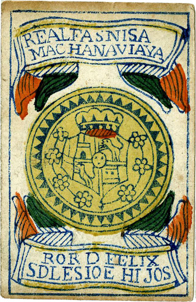 Above: cards from a pack by Don Félix Solesio destined for Mexico or South America, dated 1786 on the Ace of Cups. The two of Coins has the legend Para las Indias; in other examples this might be Para Caracas or Para La Havana showing that the packs were destined for Spanish colonies in Central (West Indies) or South America. This is the official Spanish National pattern of the 18th century. Design and production was controlled from Madrid as a source of national or regional revenue. The factory was located in the town of Macharaviaya, in the province of Málaga►