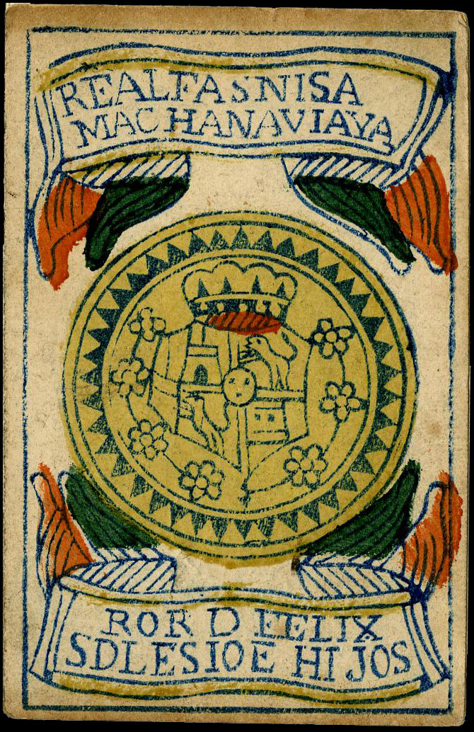 Above: an odd ace of coins having the arms of Spain on the suit-mark, above and below which are scrolls bearing poorly spelled inscriptions: 'Real Fabrica Macharaviaya por D. Felix Solesio e hijos.' © The Trustees of the British Museum