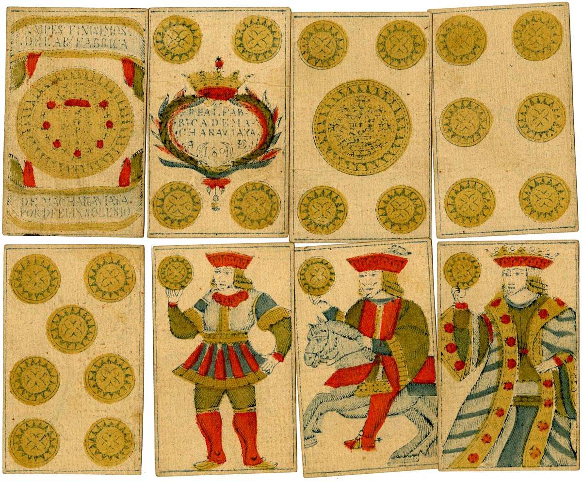 The ace of coins has the arms of Spain with two scrolls bearing the legend "Naipes Finisimos de la R. Fabrica de Macharaviaya por D. Felix Solesio". Other inscriptions on the cards include the 4 of coins which reads "Real Fabrica de Macharaviaya 1801" and the ace of cups reads "1801". From the mid-18th century the words Ahi Va, Ahivá or Aíva often appear at the bottom of the caballo of cups, as in this example. It means literally ‘there he [it] goes’ - colloquially a breezy exclamation of approval or encouragement.