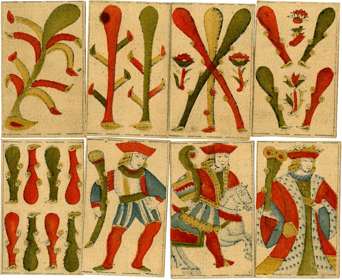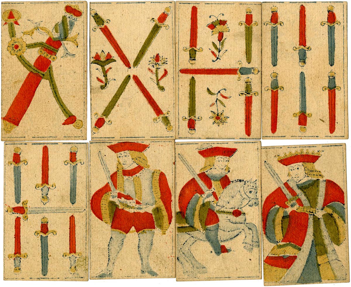 Above: Félix Solesio e Hijos, Fábrica de Macharaviaya, 1801. 48 cards, hand-coloured woodcuts. Backs printed in blue with a pattern of stars. © The Trustees of the British Museum • Museum number 1896,0501.856►
