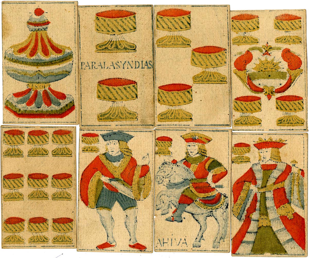 Since the late 18th century production of the Spanish National pattern was carried on under control of the Real Fábrica de Madrid monopoly, thereby prolonging its life as the orthodox design of the time. Another branch of the Royal Manufactory was set up in Macharaviaya (Málaga) to supply South and Central America, and the Madrid cardmaker Félix Solesio was put in charge. The inscription “Paralasyndias” can be read on the two of cups, showing that the pack was intended for Spain's West Indian colonies.