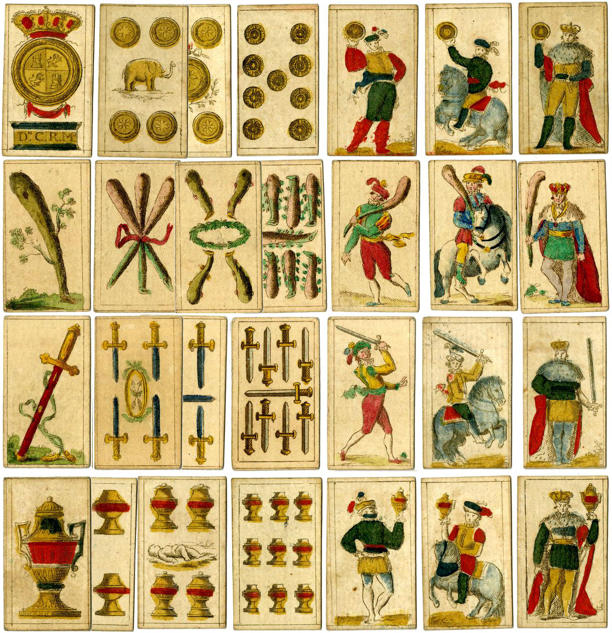 A miniature pack of 48 playing-cards in the British Museum collection, measuring 22x40 mm. The court cards are fancifully treated and each of the fours has a vignette. On the ace of coins are the arms of Spain with the inscription “Dn. C. R. Md.” (the curator has commented “Possibly Don Clemente Roxas, Madrid”). The cards have no border-breaks (pintas) or indices and are housed in a morocco case.