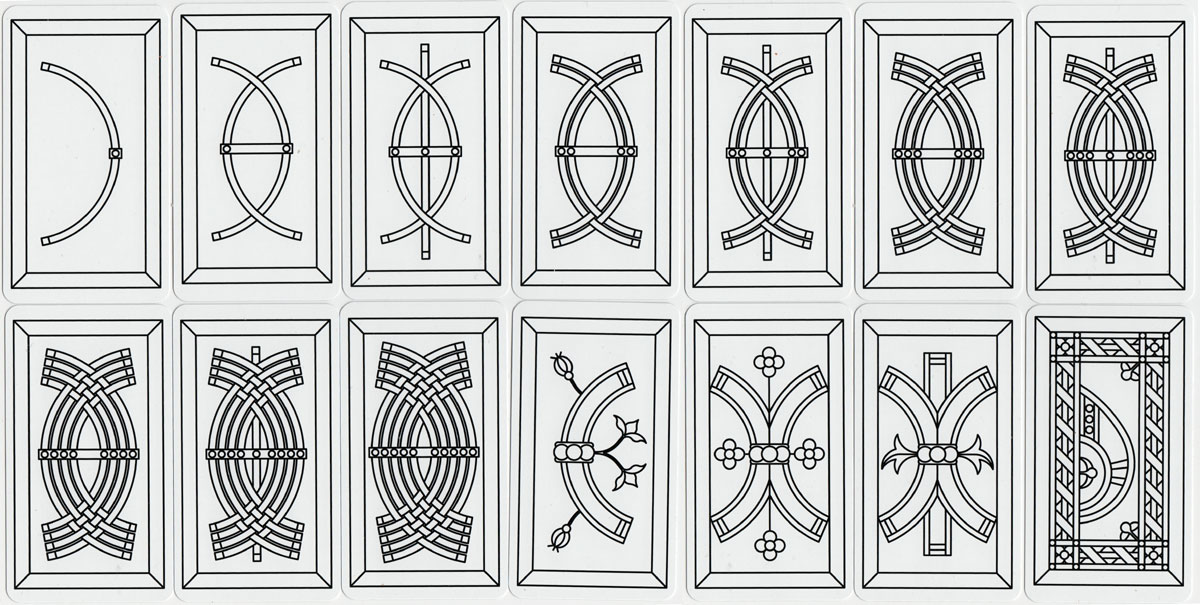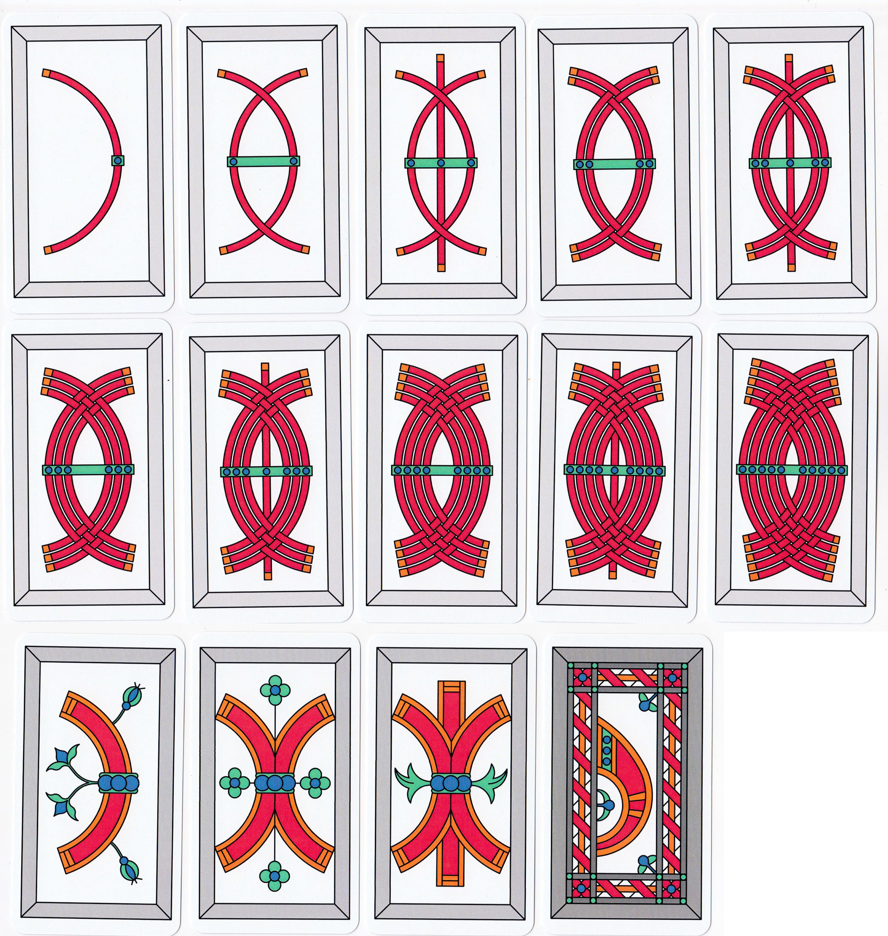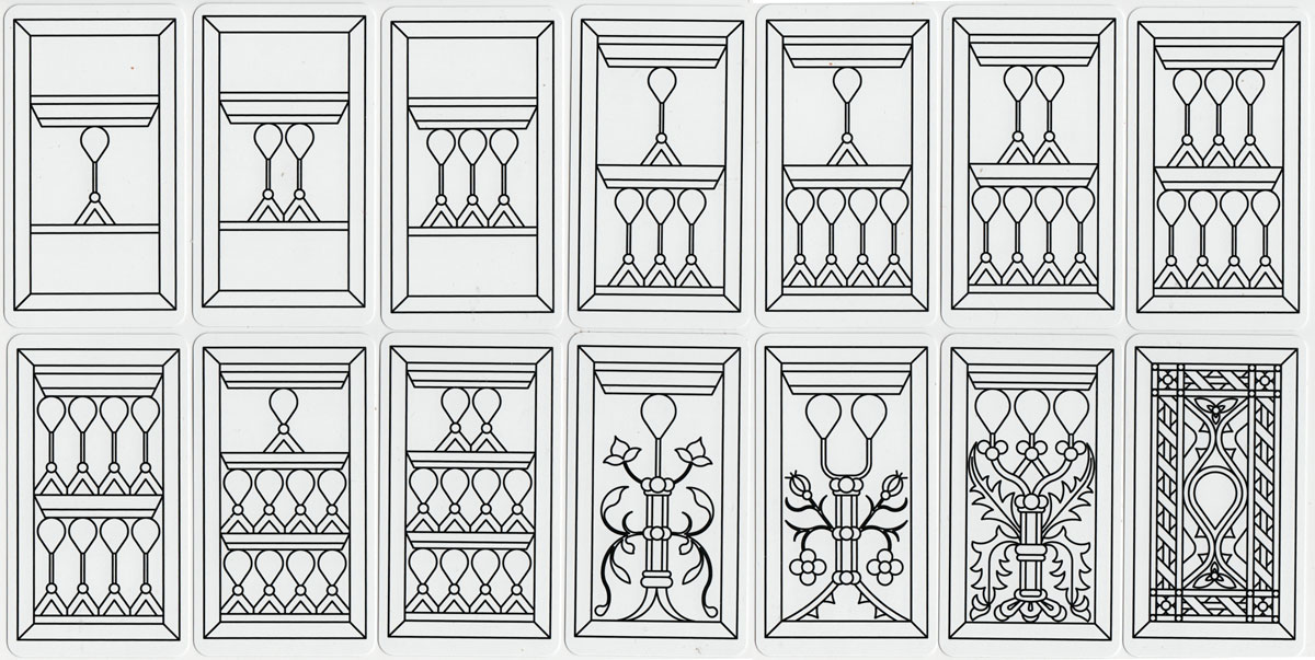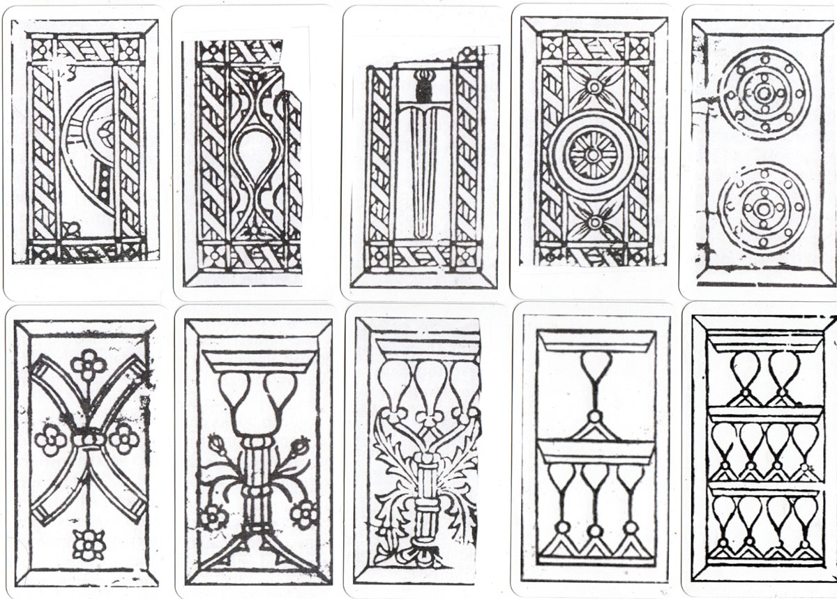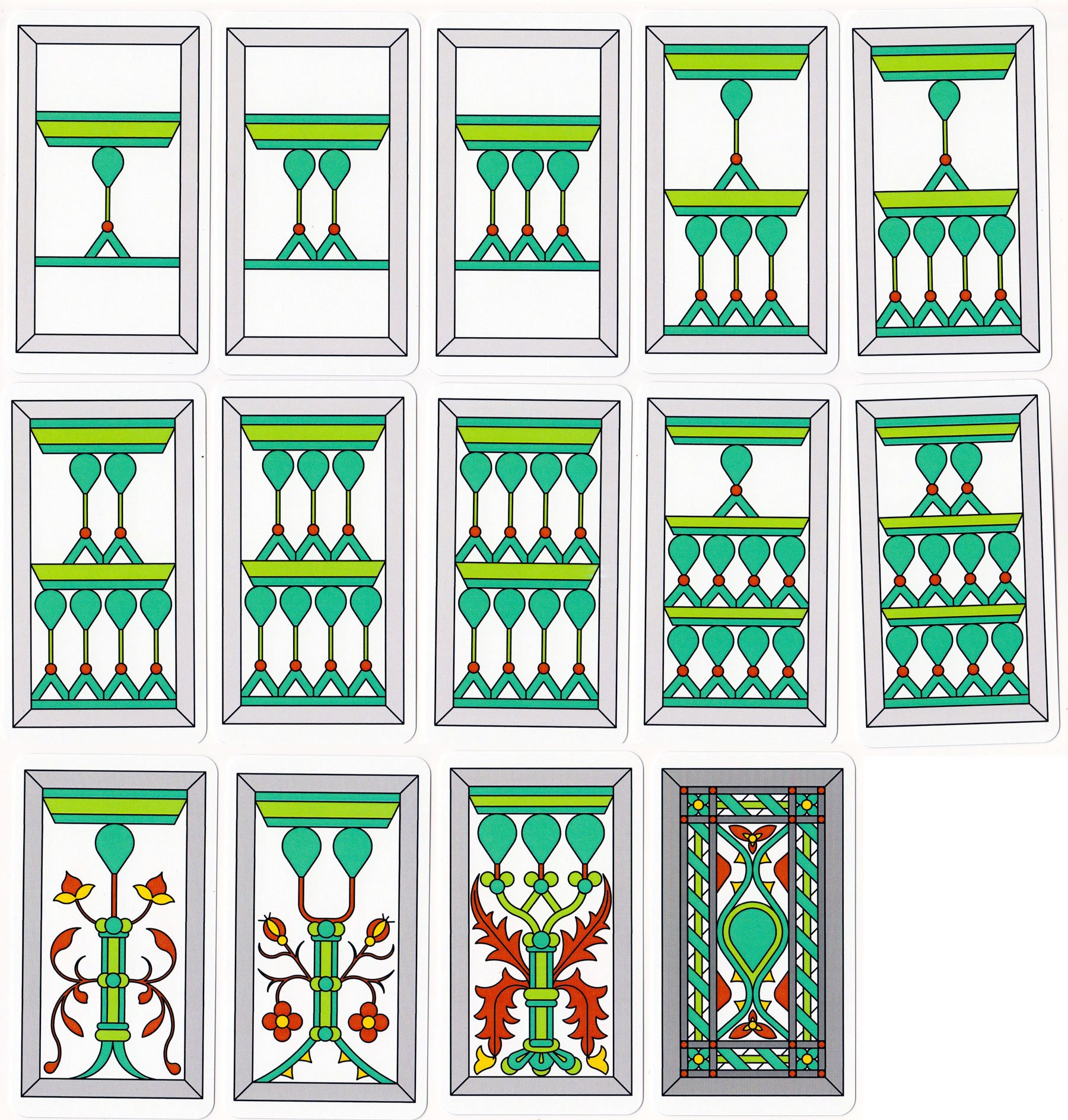 Above: the suits of polo sticks (batons) and cups from Ulrich Kaltenborn’s 2023 edition of the Moorish deck, uncoloured version. The number cards run from 1 - 10, with first deputy, 2nd deputy, 3rd deputy and king. Islamic cards do not contain images of human figures but have abstract representations only. Cards measure 56x100 mm.
