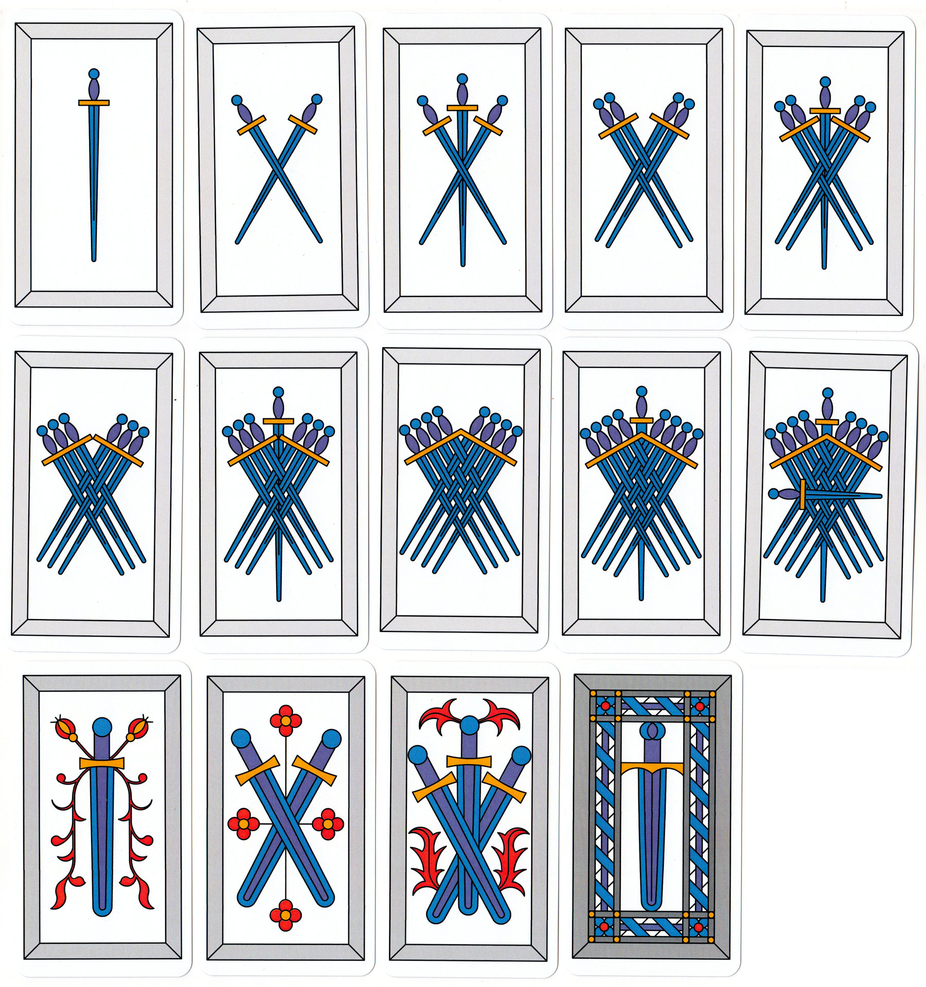 Kaltenborn’s new edition of the Moorish deck comes in two versions: black-and-white and coloured. It includes facsimiles of the surviving original cards, plus a 56-card recreated pack in which the missing cards have been imaginatively conceived. Interestingly, he has reconstructed it as a 56-card pack with numerals 1-10 plus four court cards per suit, in line with the format in which early Italian playing cards and tarot appeared, and also featured in his facsimile of the Mamluk deck.