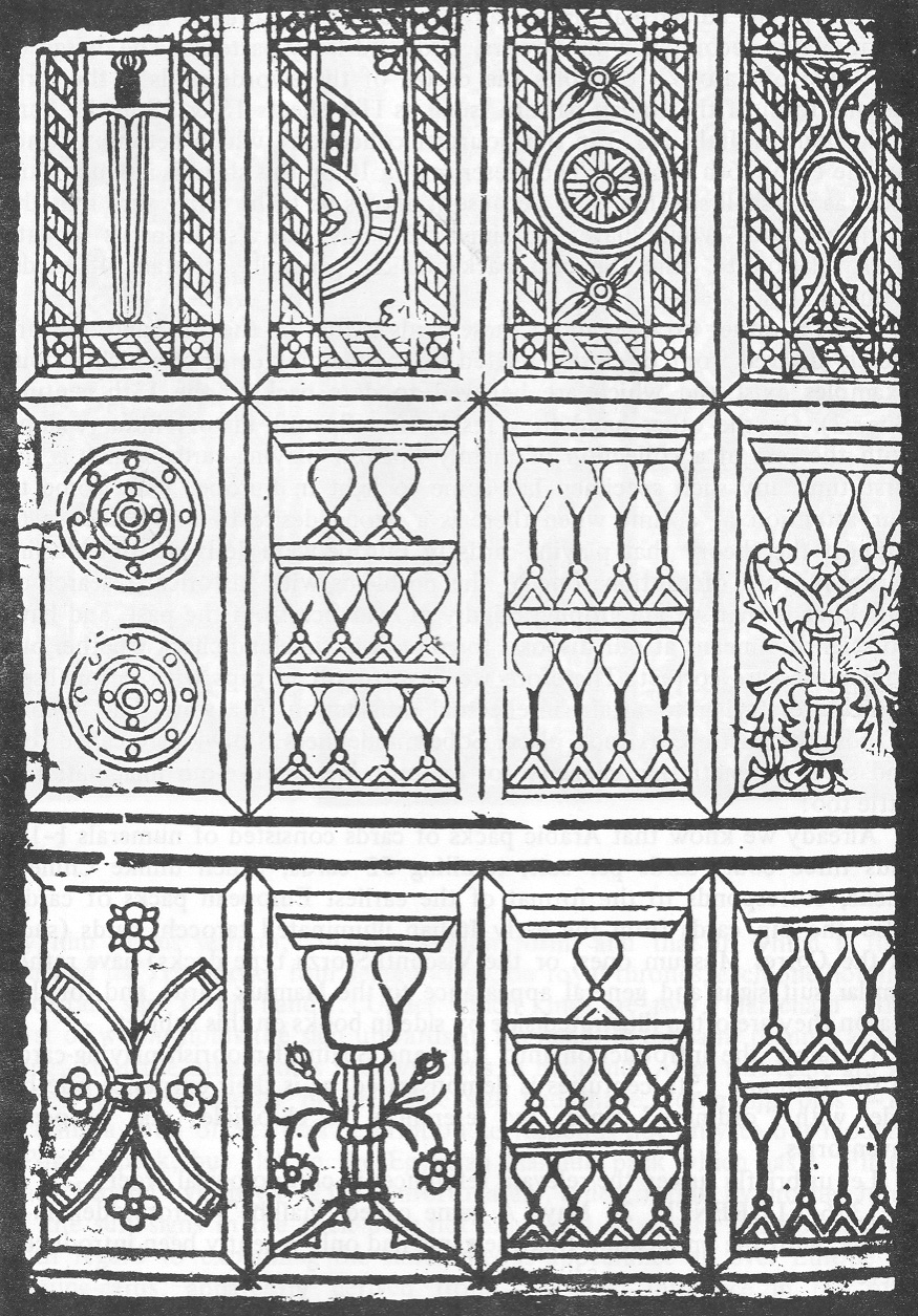 This sheet was found inside the bindings of a copy of "El libre de les Dones" which was printed in 1495 by Johann Rosembach who worked in Catalonia from c.1490 to 1530. The title page of this book contains a woodcut in the same massive style with strong vertical black lines which characterises the sheet of cards. It is perfectly conceivable that the sheet of cards was a printer's proof produced in the same workshop, and subsequently used as stiffening for the book-covers, and so on the basis of this association I shall label this the "Rosembach" sheet. Observe, on the "Moorish" sheet, the bold black outlines, the leaf and floral decorations, the design of the coins, etc., similar to Rosembach's style. A possible explanation is that Rosembach, or whoever made them, made both sheets for different clients, since we know that "Moorish" and "ordinary" playing cards were recognised.
