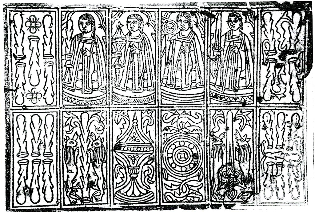 Consisting of three rows of four cards, printed in heavy black outlines on whitepaper, the sheet shows 12 cards. Examination of the edges of the sheet reveals that the original block contained at least 4 more cards, but which have been cut off our example. On the first row are an ace of swords, vertical and pointing downwards, followed by what we must consider to be the ace in a suit equivalent of batons, i.e. curved clubs, polo-sticks or similar. The third card in the top row is an ace of coins or discs and the fourth an ace of cups. Admittedly, the cup does not look quite the same as a cup on ordinary European playing cards, but comparison with other Arabic cards permits this association. These four cards are distinguished from the others on the sheet by their broader borders which incorporate a sort of spiral ribbon round a central shaft, with floral motifs at each corner.