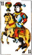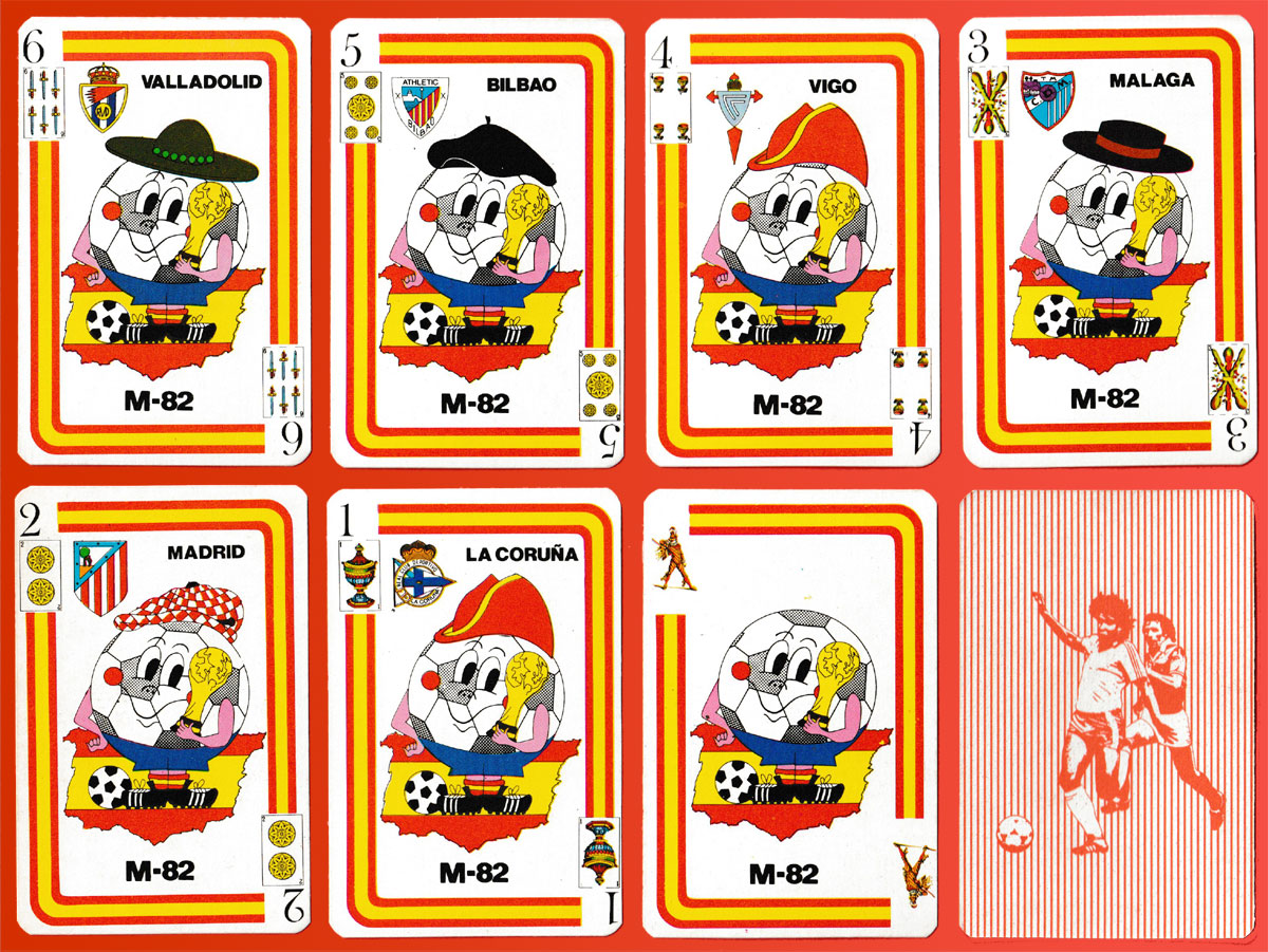 The central image shared by these two packs is of a humanised football with various types of headgear, holding a trophy and standing on a map of Spain. However, this is not exactly the mascot of the 1982 World Cup which was ‘Naranjito’, the little orange. Perhaps the publishers of these packs were trying to avoid having to pay royalties on the ‘Naranjito’ image. Also included in the designs are the names of the 14 Spanish cities which hosted matches that year together with the badges of clubs linked to those cities. Finally, there is a border in red and yellow (the colours of the Spanish flag), interrupted twice by the card value for the French-suited pack and a miniature playing card for the Spanish-suited pack. The image on the reverse is of two footballers in action against a striped background (green for the French-suited pack, orange for the Spanish-suited pack). The quality of the card stock is poor. See the boxes►