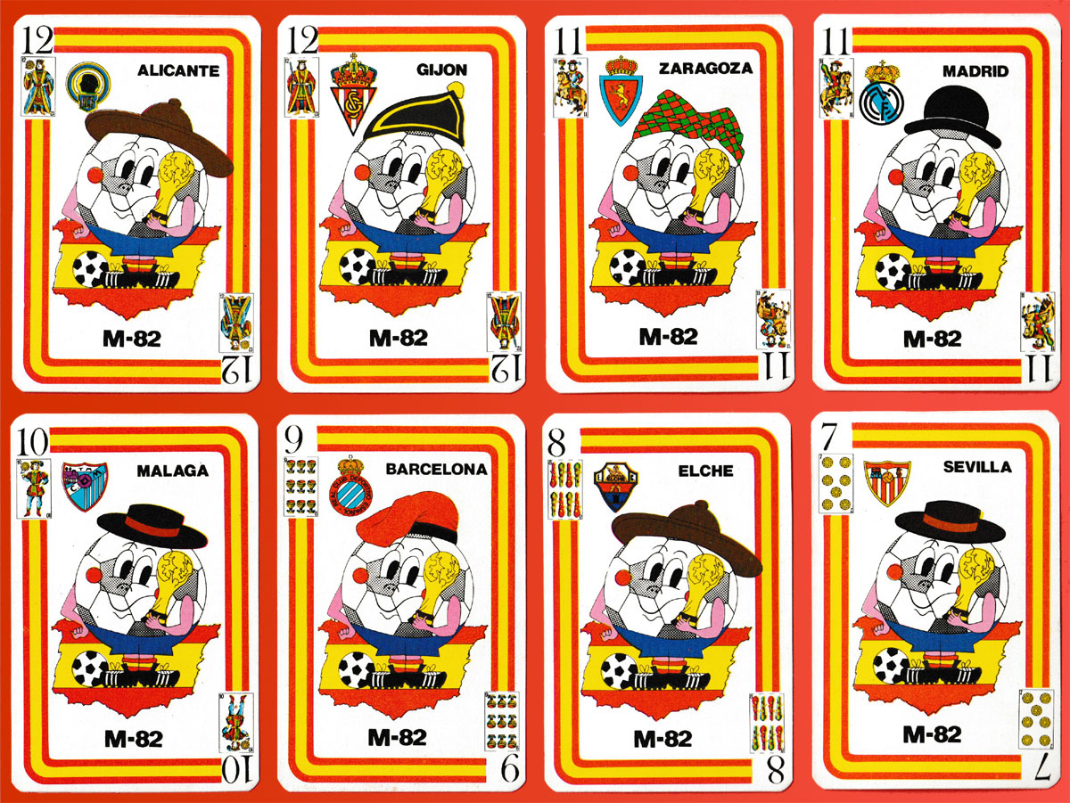 Above: Mundiales 82 playing cards with Spanish indices, Maker unknown, 1981. 48 cards + 2 (identical) Jokers in tuck box. Size: 62 x 95 mm.