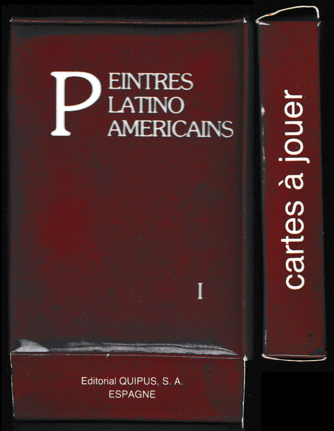 Above: ‘Peintres Latino Americains’ playing cards published by Editorial Quipus, S.A., Spain, 1986. Printer unknown (possibly Quipus?). 52 cards + 2 Jokers in tuck box. Size: 67 x 91 mm.