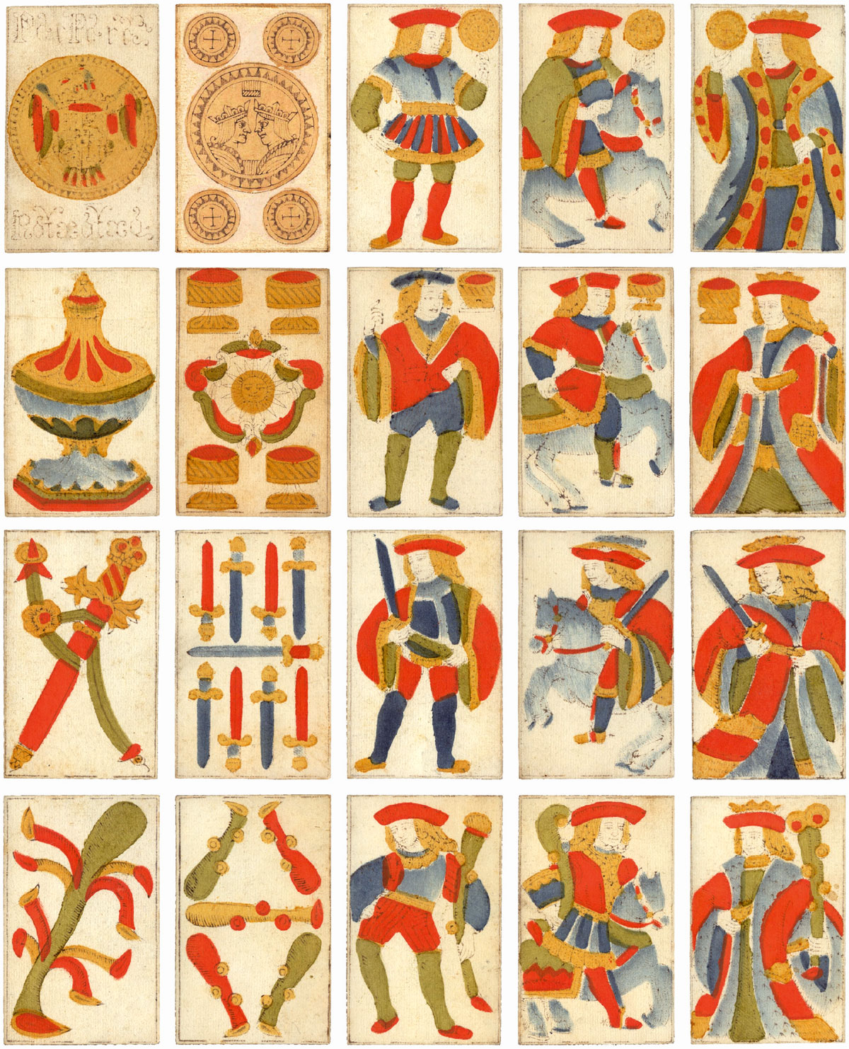 An antique Spanish National pattern deck produced by Pere Pau Rotxotxo Puigdoura (active 1766–1797). The Rotxotxo family of cardmakers is recorded at the start of the seventeenth century in Barcelona and successive heirs continued to manufacture cards in this traditional design until the early 19th century. The deck was signed by the tax inspector on the six of cups, as was customary in Catalonia before it became mandatory in the rest of Spain.