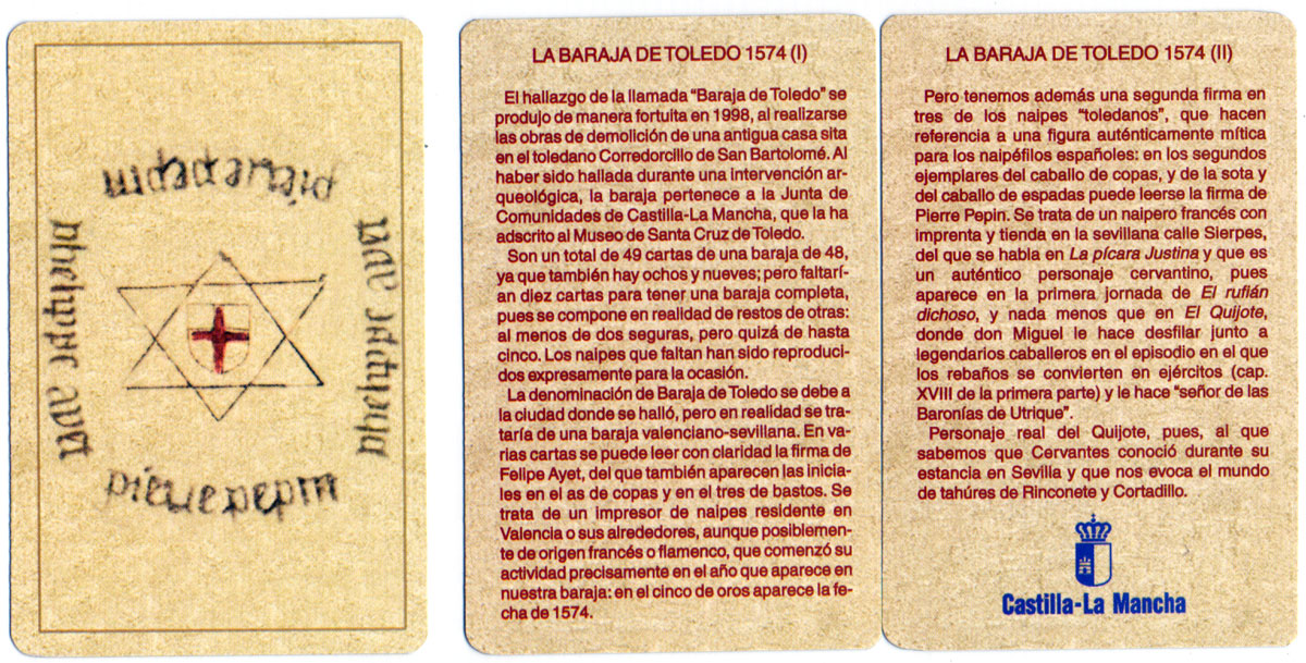 Above: facsimile cards of archaic Spanish-suited pattern, printed from woodcuts by Phelippe Ayet and and Pierre Pepin, dated 1574 with the place of issue stated as Thiers on the two of swords. Phelippe Ayet was a card maker living in Valencia. Pierre Pepin was a French card maker who operated in Seville and who was known by Miguel Cervantes. A total of 49 assorted cards by these different makers were found hidden in the lintel of a doorway, in an old building in Toledo, during demolition, and are now preserved in the the Museo de Santa Cruz de Toledo. Size: 57 x 98 mms, reverse blank. Another similar pack has been discovered in Madrid by the same maker, who was recorded as residing in the Valencia region at that time. Cards from facsimile edition by Naipes Comas, 2002. The set includes 2 explanatory cards→