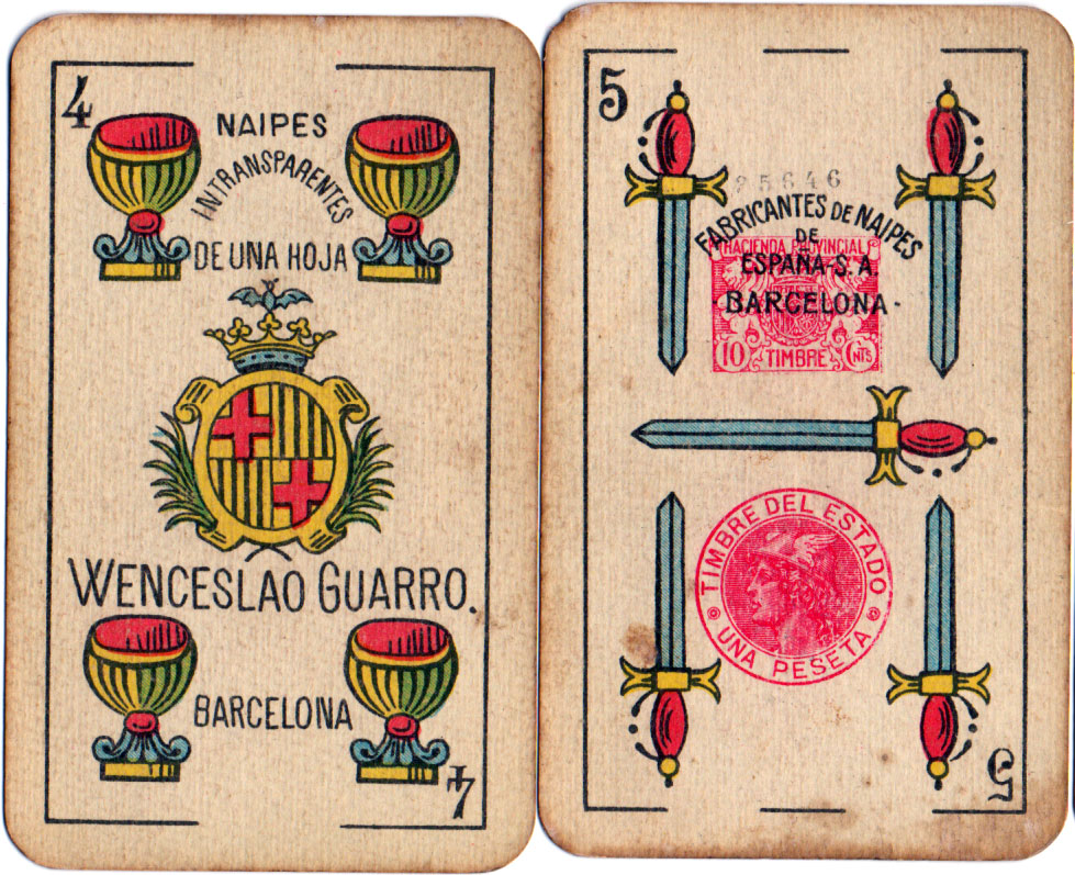 Above: Wenceslao Guarro Catalan Pattern by Fabricantes de Naipes de España, c.1925. The four of cups has two tax stamps (click image to zoom); the short-lived regional (provincial) tax and the national tax.