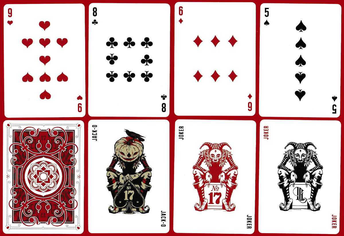 There are two jokers, a third card depicting a pumpkin-headed “Jack-O” (jack-o'-lantern?), and a gaff card. The Bicycle® branded version has a cherry red back.