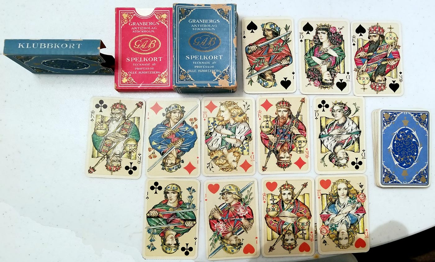 Some 6 versions of this deck are known containing small differences, with or without an outline or a toned background, and some changes in the Jacks' helmets in some editions, and with different back designs. No.102 is Klubbkort, and No.101 is Standardkort.