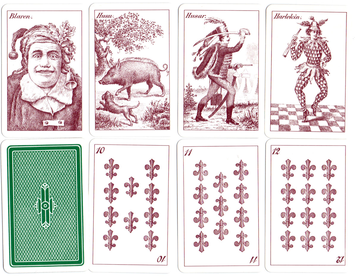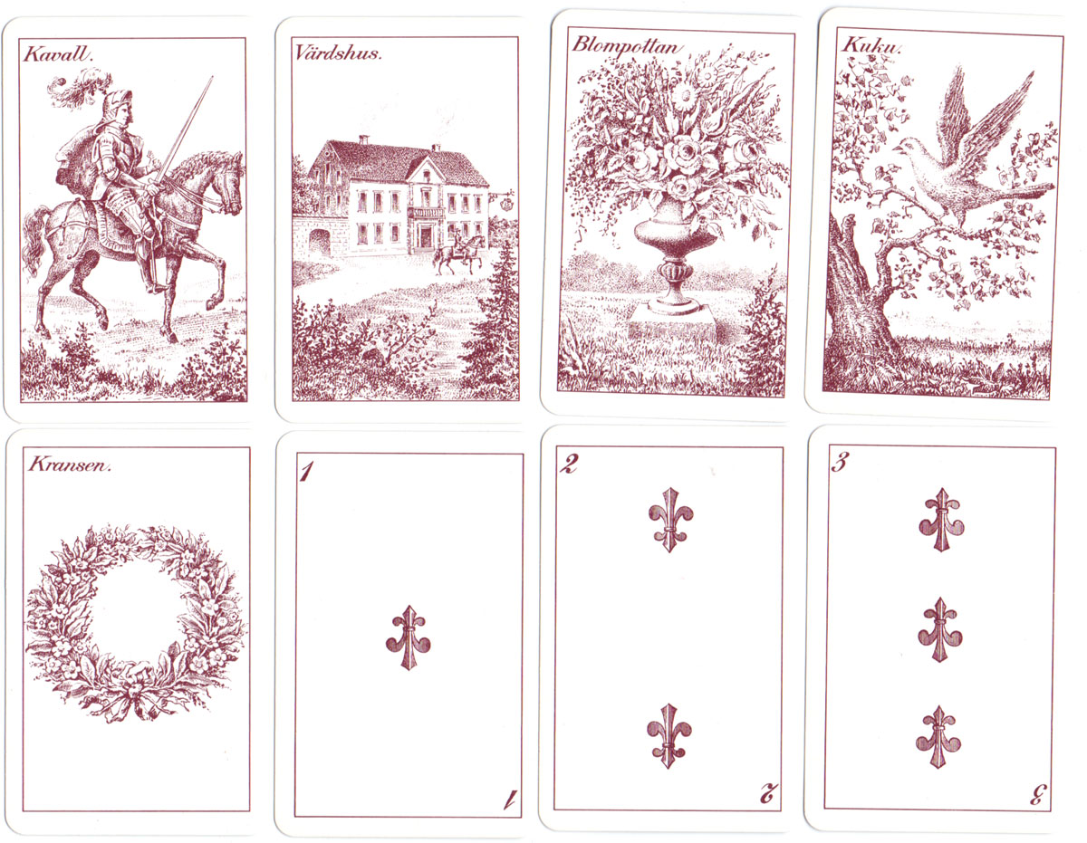 Modern edition of the historic game by Esselte Öbergs AB, Eskilstuna, c.1977. 42 cards of a single suit, comprising two copies of 21 distinct cards.