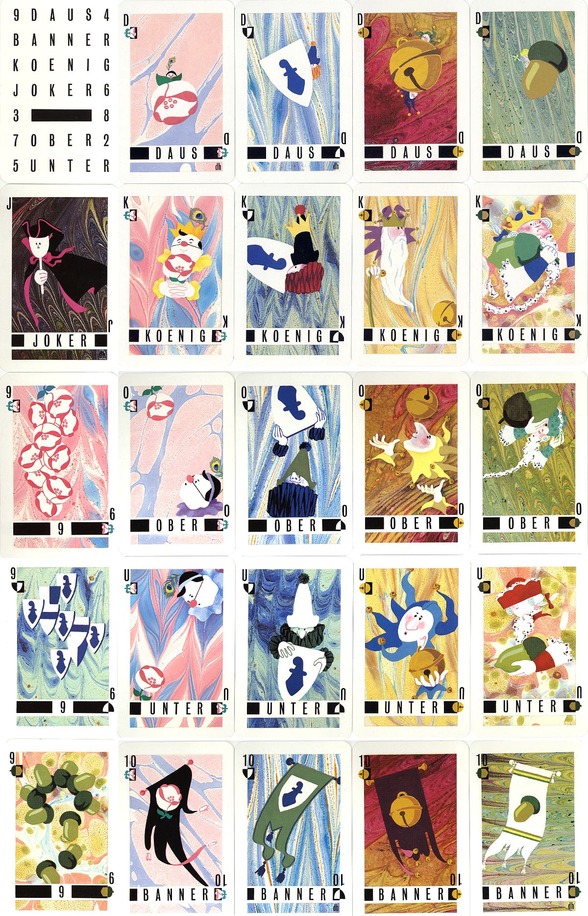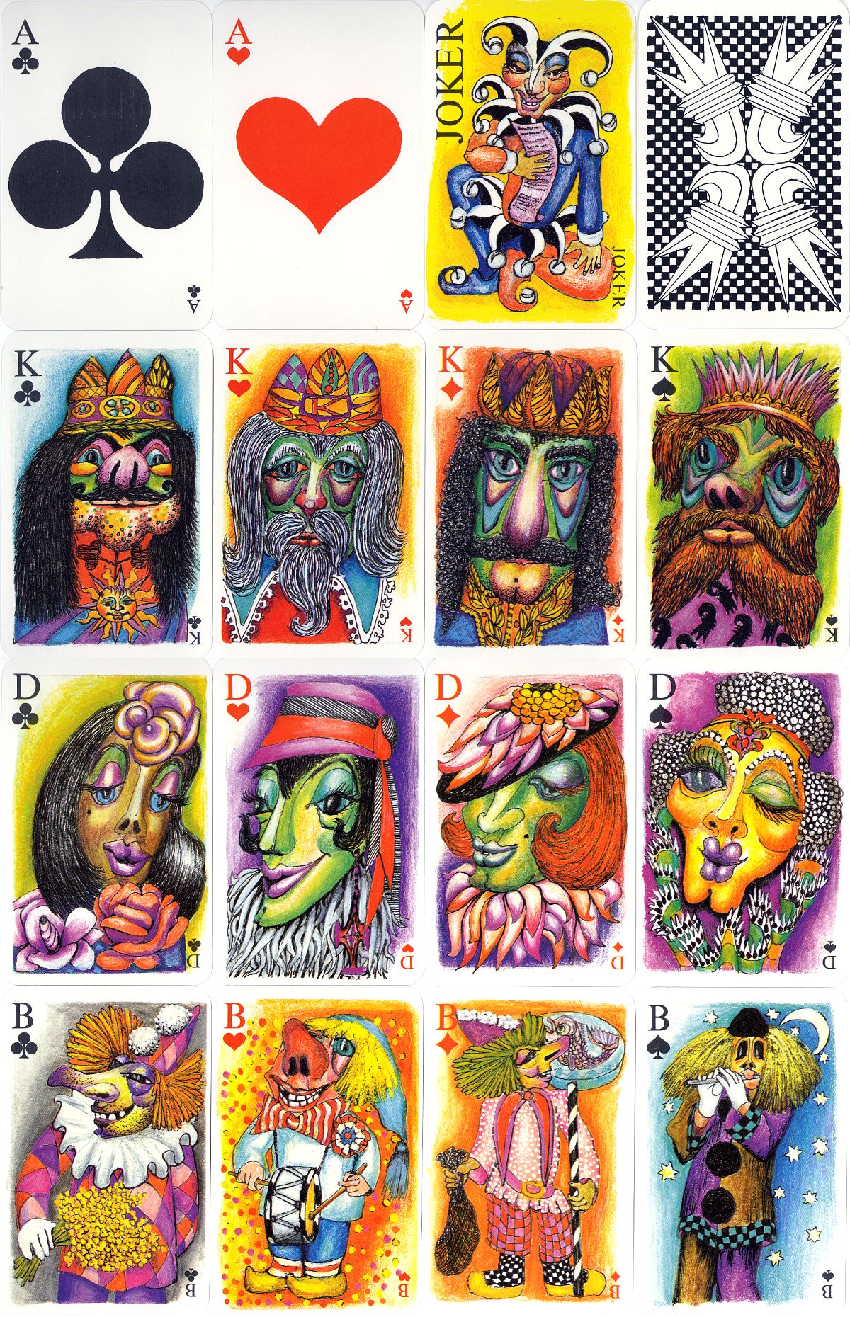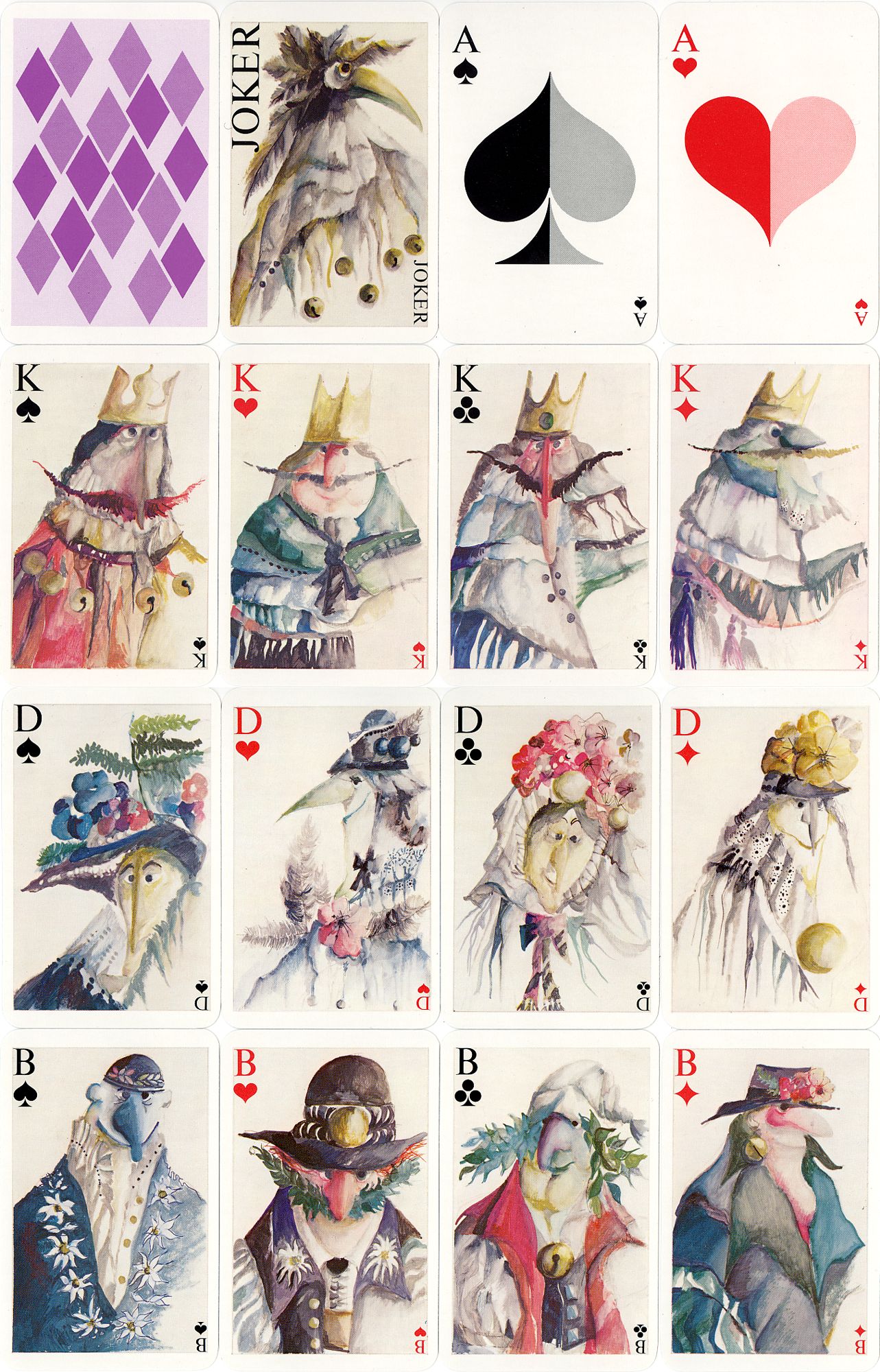 Above: the 12 court cards from the 1987 Basler Fasnachts-Karten deck designed by Marianne Pomeroy and printed by Müller A.G., Neuhausen a/R. 52 cards + 3 Jokers.