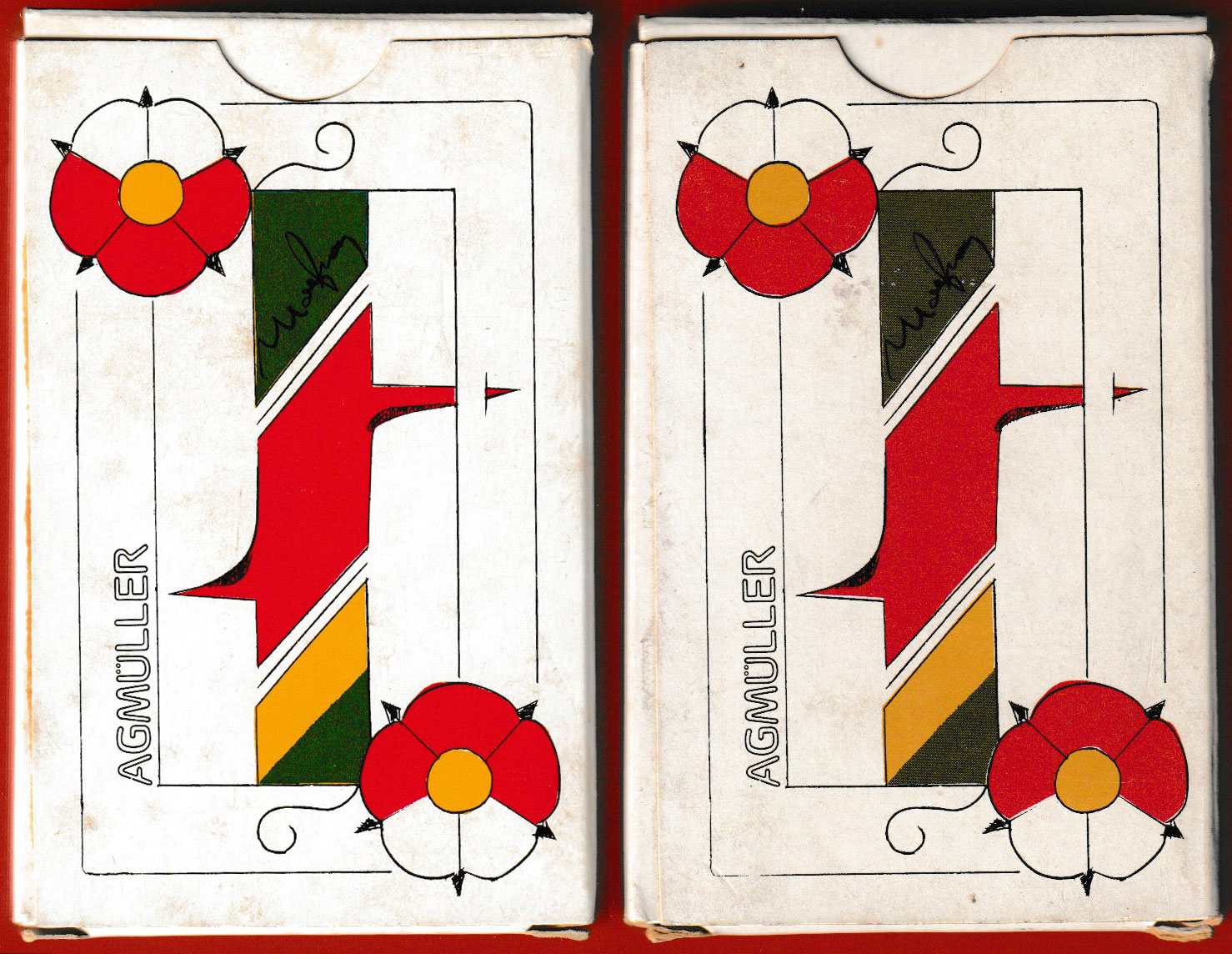 In 1978 the Swiss manufacturer AG Müller decided to redesign the Swiss pattern, in the hope that the traditional designs could be updated and reinstated as a strategy to overcome the foreign playing cards flooding into the market. They commissioned Egbert Moehsnang, who in consultation with a leading art historian took almost two years researching and designing the cards. Moehsnang produced this contemporary Swiss-suited, double-ended pack, based on original XV century sources, with highly legible indices and colour scheme, but they were simply shunned by card players and the idea wasn't successful.