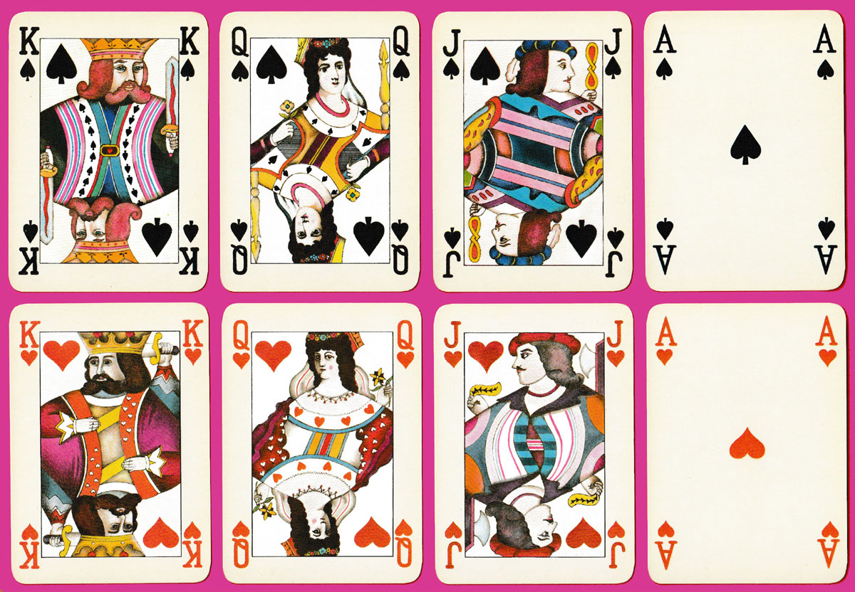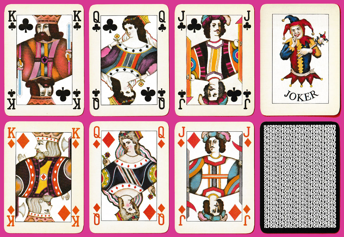 Surprisingly for a company known for the manufacture of black-and-white film, this pack has extremely colourful court cards. The designs by Mario Grasso (1941-2018) are based on standard English pattern courts: some traditional elements and attributes have been retained, but several of the heads (especially those of the Queens) and costumes are quite far removed from the familiar ones. The back design is in black and white – the word ‘ILFORD’ repeated over and over. The cards have gilt corners. A high-quality board has been used. See the box►