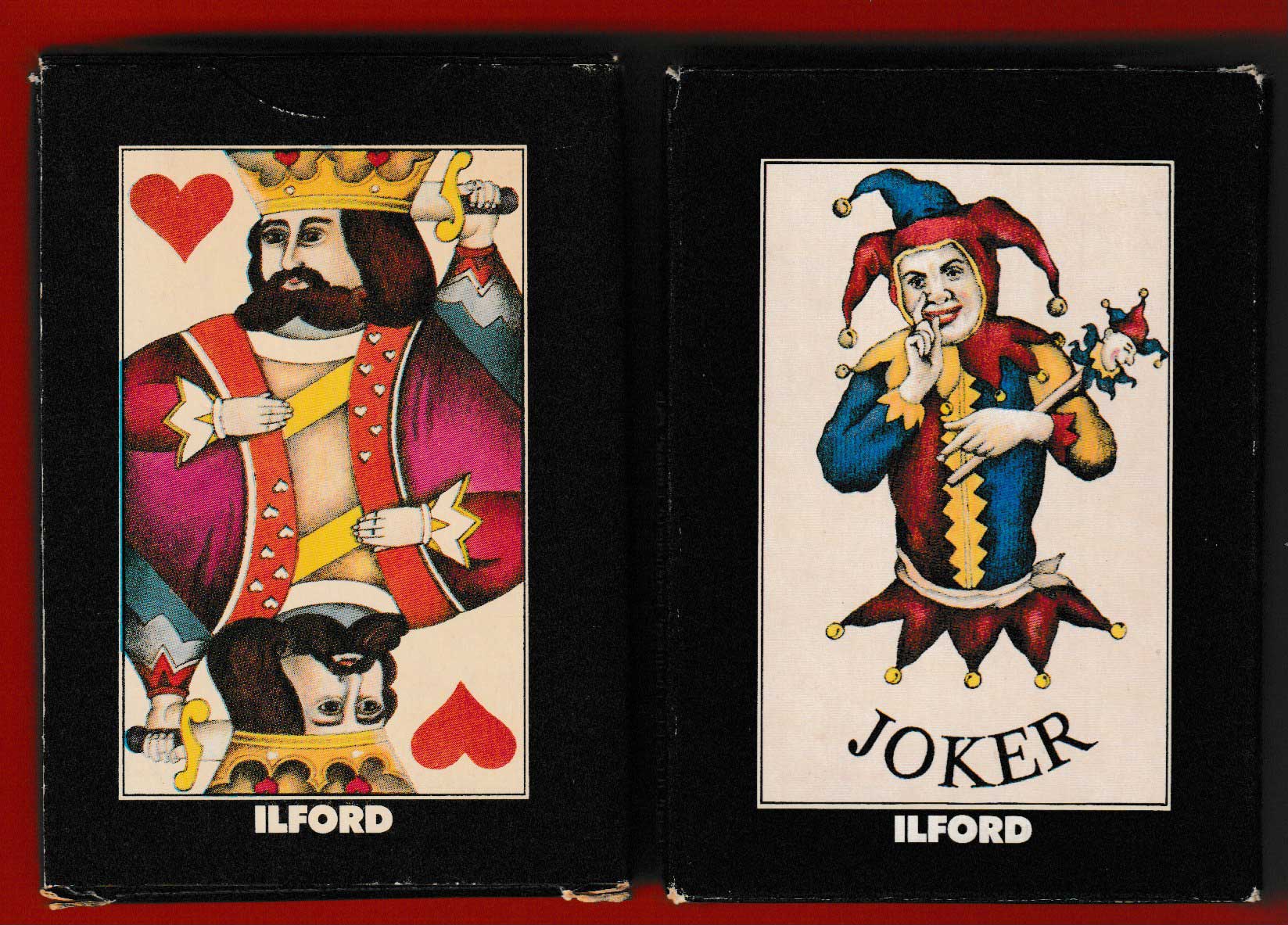 Above: Ilford playing cards printed by AG Müller & Cie, Schaffhausen, Switzerland, for Ilford Limited, Basildon, UK, 1981. 52 cards + 3 (identical) Jokers in tuck box. Size: 62 x 87 mm. © 1981, ILFORD Limited, Basildon, Essex, GB.