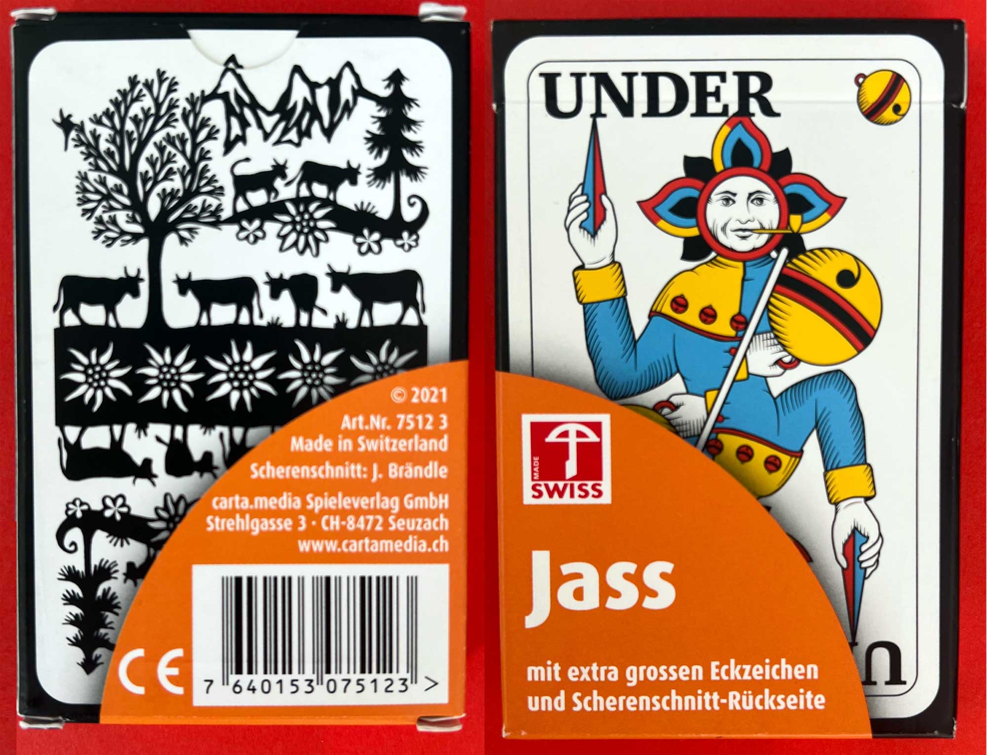 The Ace of Hearts bears the carta.media¹ company logo, while the Ace of Bells features a “Made in Switzerland” emblem, serving as a designation of origin. The design is legally protected, as indicated by a copyright notice in the border text of the King of Bells. This modern pattern exemplifies the trend of adapting traditional regional card designs for contemporary production and usage, balancing visual clarity with cultural continuity.