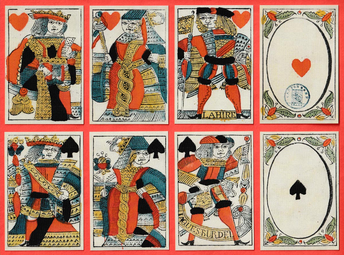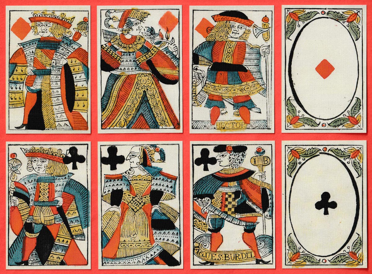 The cards shown here have been faithfully reproduced from an original pack of c1835 by Jean-Jacques Burdel, the last of the Burdel dynasty, in the collection of Walter Haas. The originals would have been printed from woodblocks and stencil coloured. The maker’s name appears on the Jack of Spades and the Jack of Clubs, with a tax stamp for the canton of Bern on the Ace of Hearts. The cards have square corners and a modern finish.