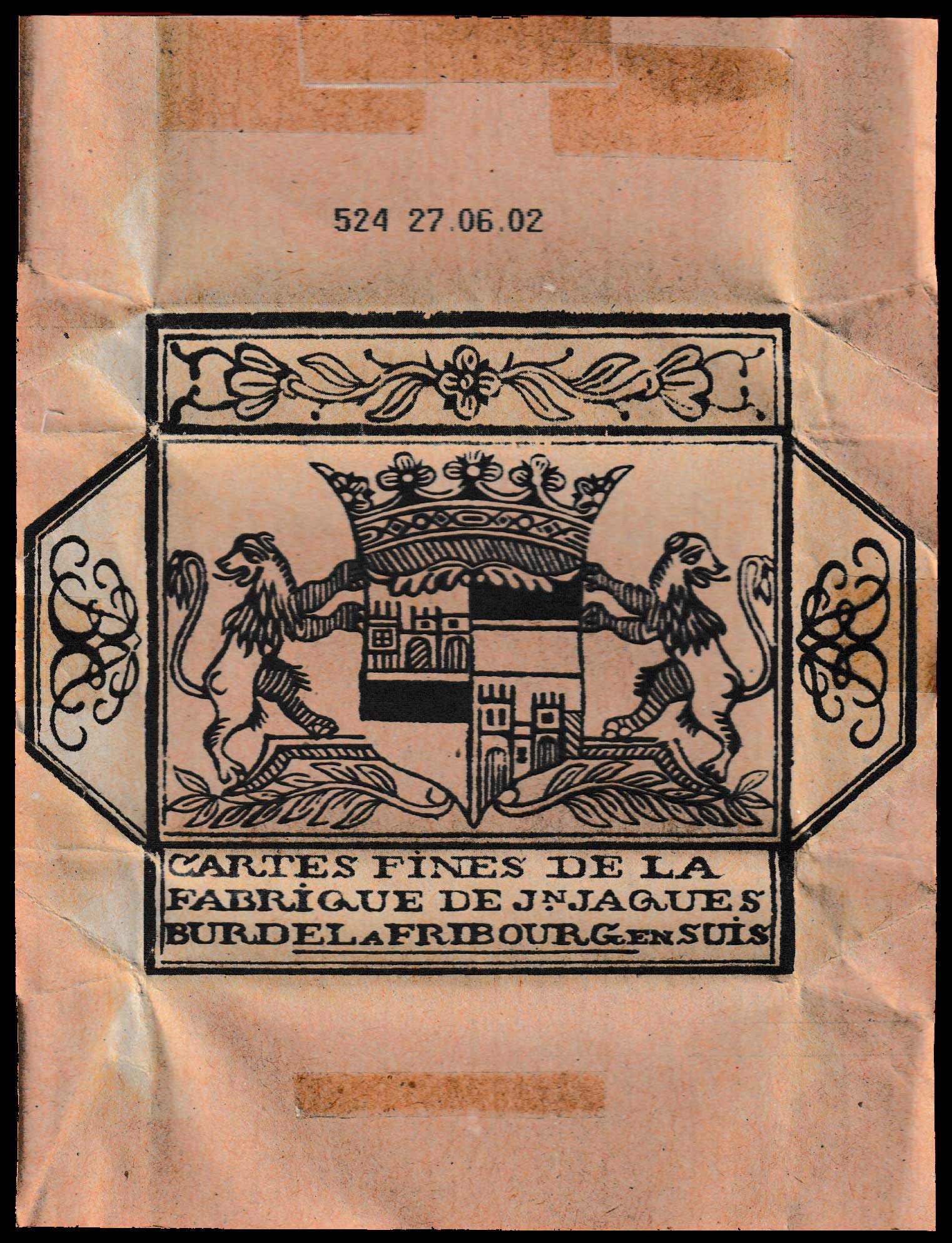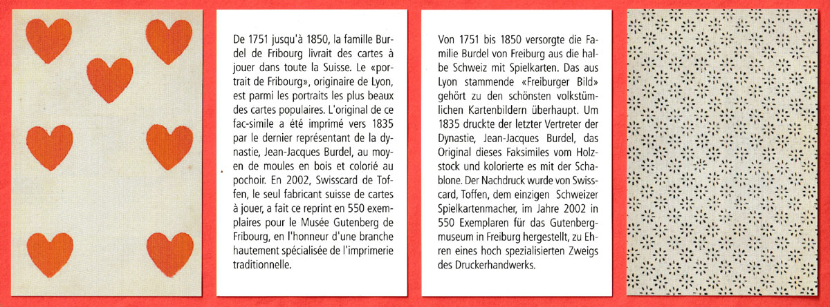 Fribourg (or Freiburg in German) sits on the cultural border between the German- and the French-speaking parts of Switzerland. French-suited cards are more commonly used there than Swiss-suited ones. Indeed, thanks to some local card makers, notably the Burdel family, Fribourg had its own standard pattern. This pattern owes much to cards originating from Lyon in France, with the attractive addition of decorated aces.