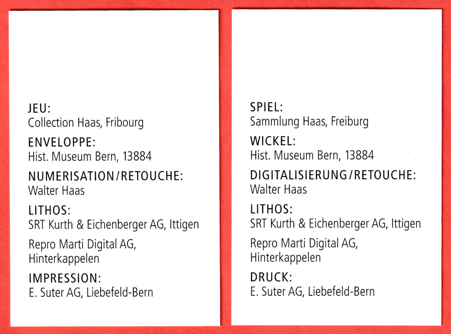 This reproduction was printed by Swisscard of Toffen for the Musée Gutenberg in Fribourg (now in the process of relocating to Derendingen). The edition was limited to 550 packs, with the number and date stamped discreetly on the wrapper (itself a reproduction of a wrapper in the collection of the Historical Museum in Bern).
