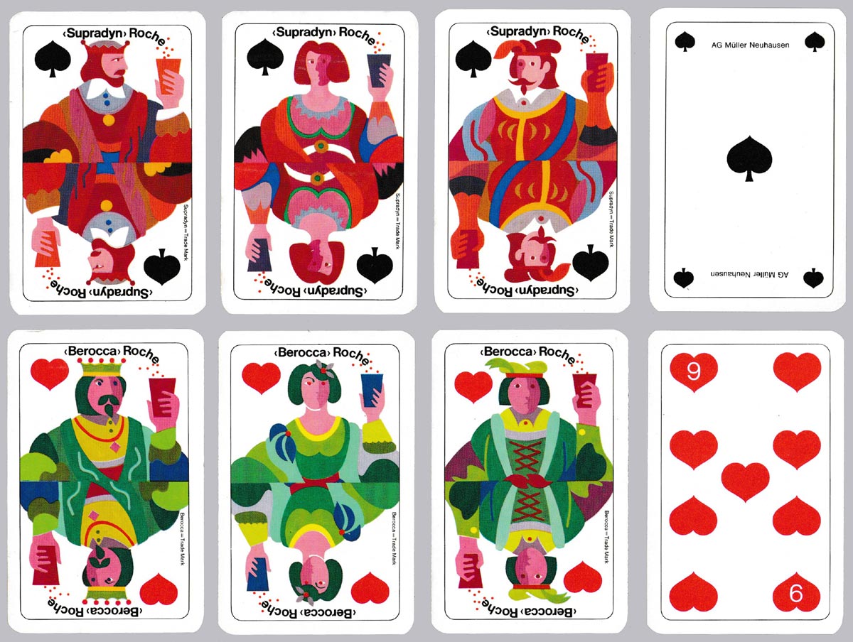 Above: Roche pharmaceutical playing cards made by AG Müller, Neuhausen, Switzerland, c1980. 36 cards in plastic box. Size: 56 x 87 mm.