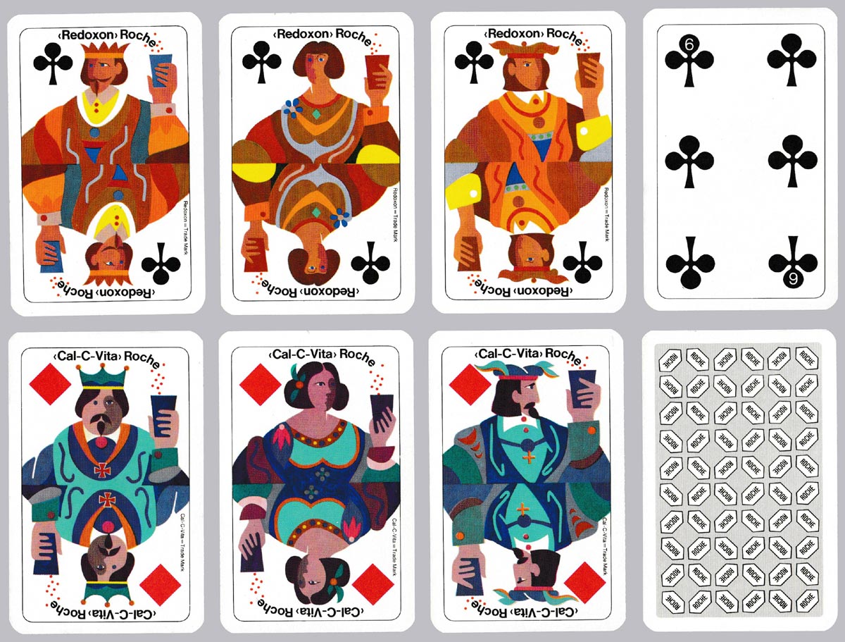 All the courts hold a glass or beaker with a fizzy vitamin preparation – Supradyn (S), Berocca (H), Redoxon (C), and Cal-C-Vita (D). These are all produced by the Swiss pharmaceutical company Roche. The maker’s name appears at each end of the Ace of Spades. The back design is formed of a pattern of hexagons, each with the word ROCHE inside, against a grey background.