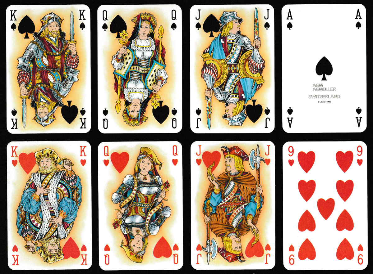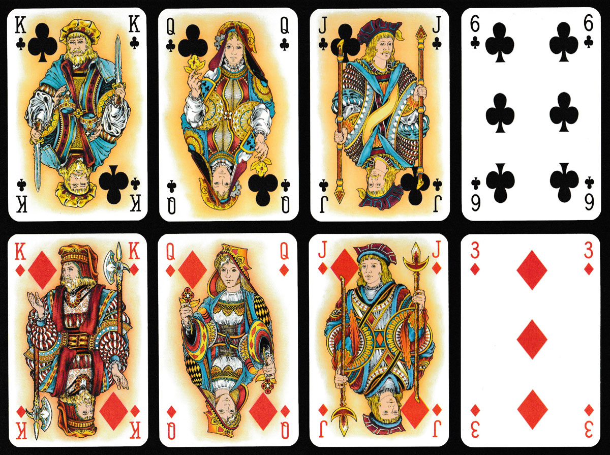 Courts in medieval costume holding both French and Italian/Spanish suit-signs.
