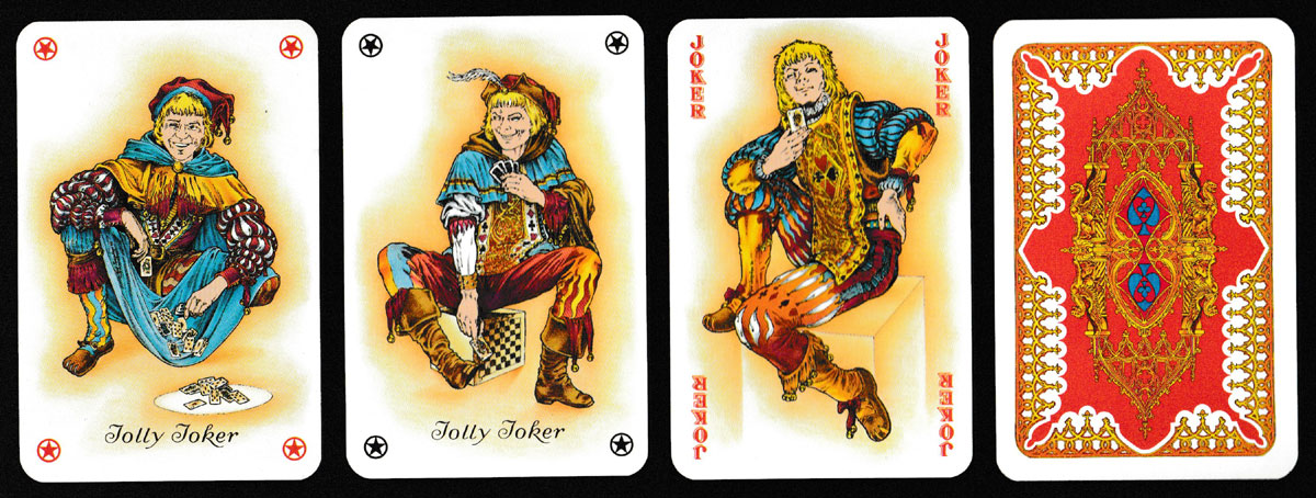 There is something intrinsically pleasing about these non-standard designs by Giorgio Tavaglione. The double-ended courts are in medieval costume, yet they retain many recognisable attributes (flowers, feathers, pikes, staffs, etc.) found in Anglo-American packs. Even the King of Hearts holds up a sword which runs behind, rather than through, his head. The maker’s name and the date are on the Ace of Spades. The reversible back design is equally attractive. Tavaglione has designed other packs which are listed below.