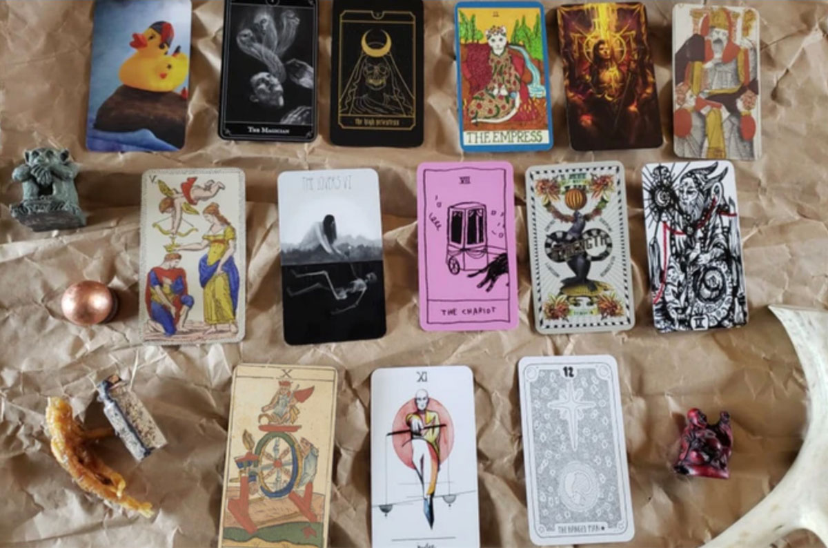 Above: the Alleyman’s Tarot: A unique collection featuring a diverse array of cards from different decks.