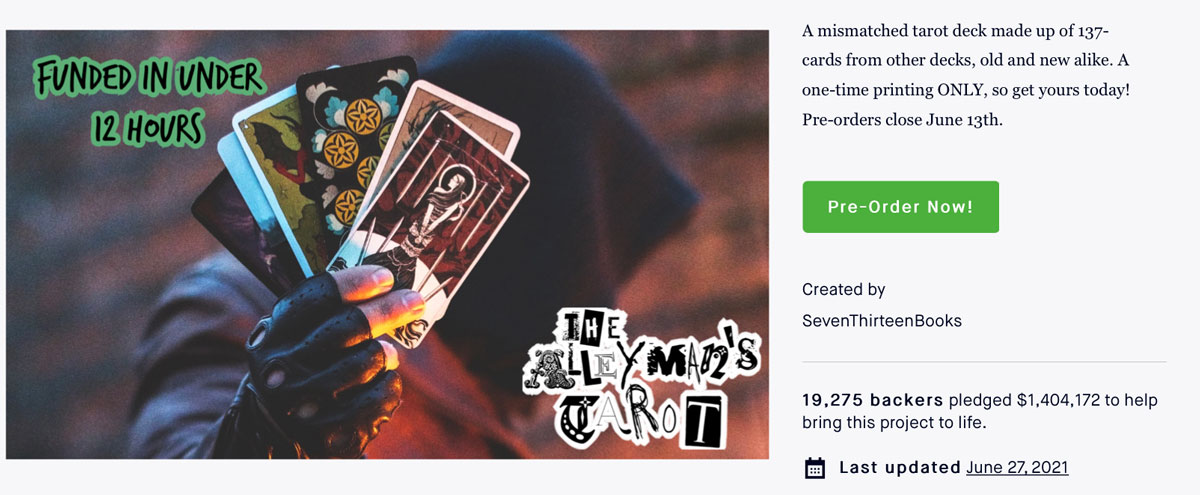 Above: funded in under 12 hours, The Alleyman’s Tarot by SevenThirteenBooks became a Kickstarter sensation, raising $1,404,172 from 19,275 backers for its unique 133-card deck.