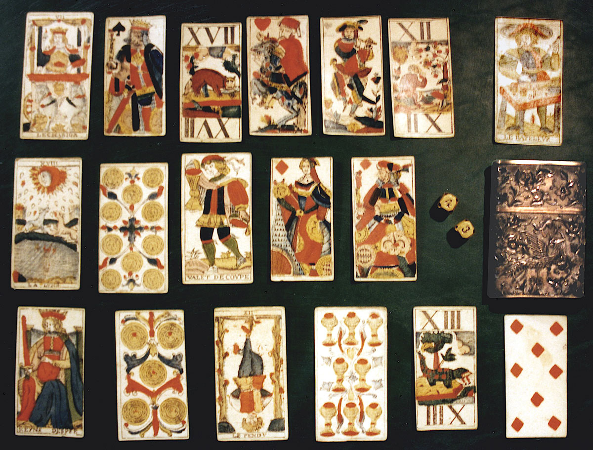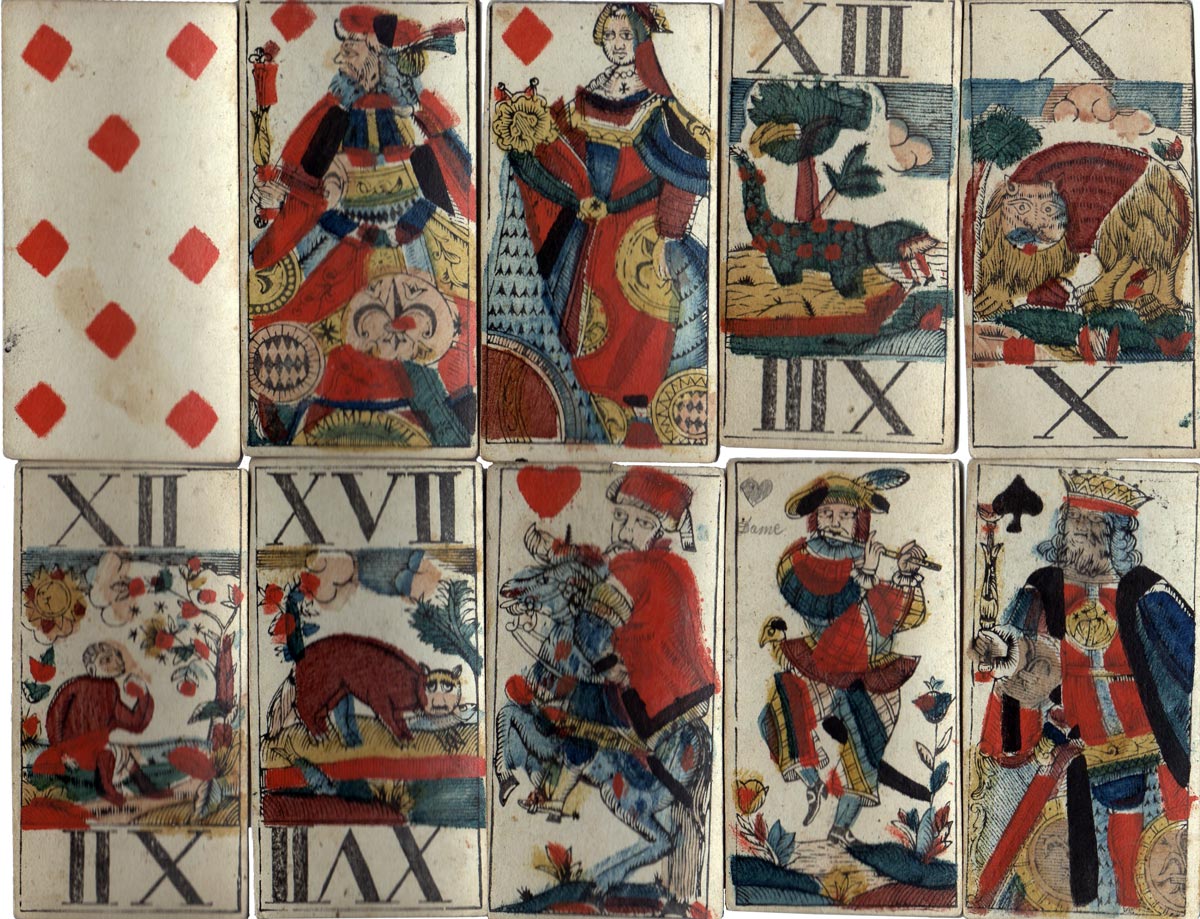Above: woodblock and stencil Animal Tarot cards, probably of Swiss origin, 2nd half 18th century. The city of origin seems to be indicated at the bottom of the King of Diamonds (A Mumijswii) but it is a real challenge to decipher. This is the most usual form of Bavarian Tarot, with panels at the top and bottom of the trump cards containing their value in Roman numerals. Lozenges of the Bavarian arms can be seen on the round shields of the King and Queen of Diamonds. Other decorative features on the court cards suggest a derivation from the old Paris pattern. The 'Fool' card in this example has been reassigned as the Queen of Hearts by a previous owner. Images courtesy Frederic C. Detwiller.