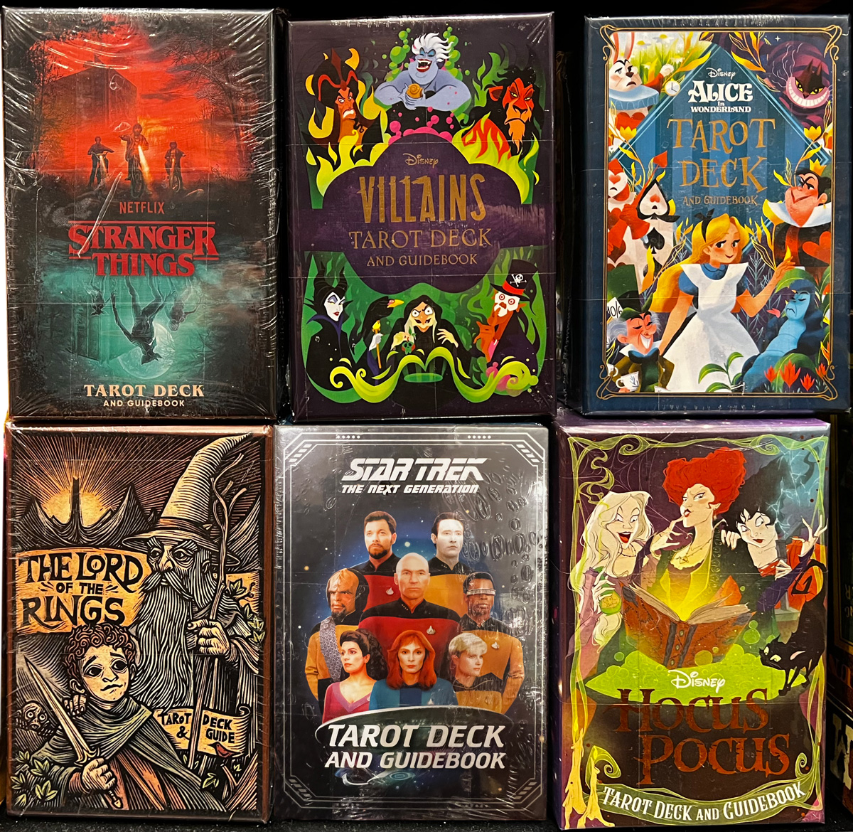 Above: Selection of branded tarot decks on shelves at bookstores. Top Row: Stranger Things Tarot produced by Netflix. Disney's Villains tarot and Disney's Alice in Wonderland tarot. Bottom Row: The Lord of the Rings Tarot, Star Trek: The Next Generation Tarot, and Disney's Hocus Pocus Tarot. Each deck comes with its own on-theme guidebook.