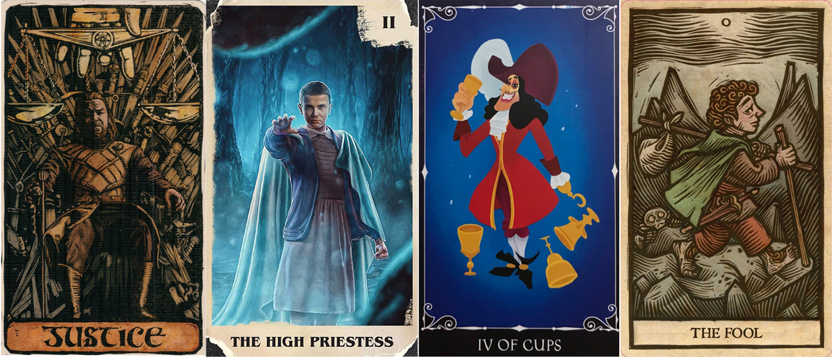 Artwork representing the Game of Thrones character such as Sean Bean as Eddard Stark as the Justice card, Eleven from Netflix's Stranger Things as the High Priestess, Captain Hook as the Four of Cups and Frodo as the Fool.