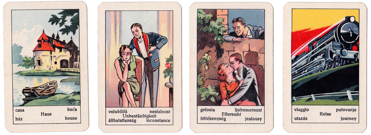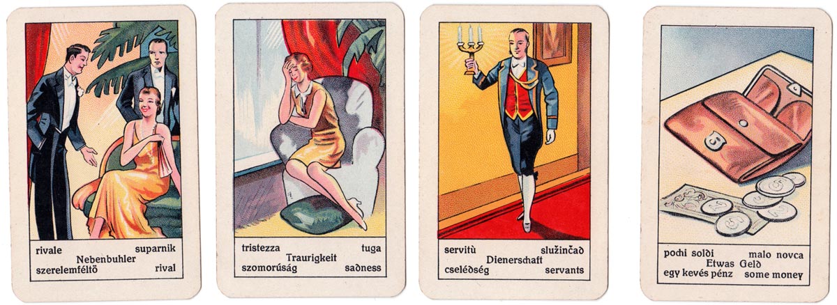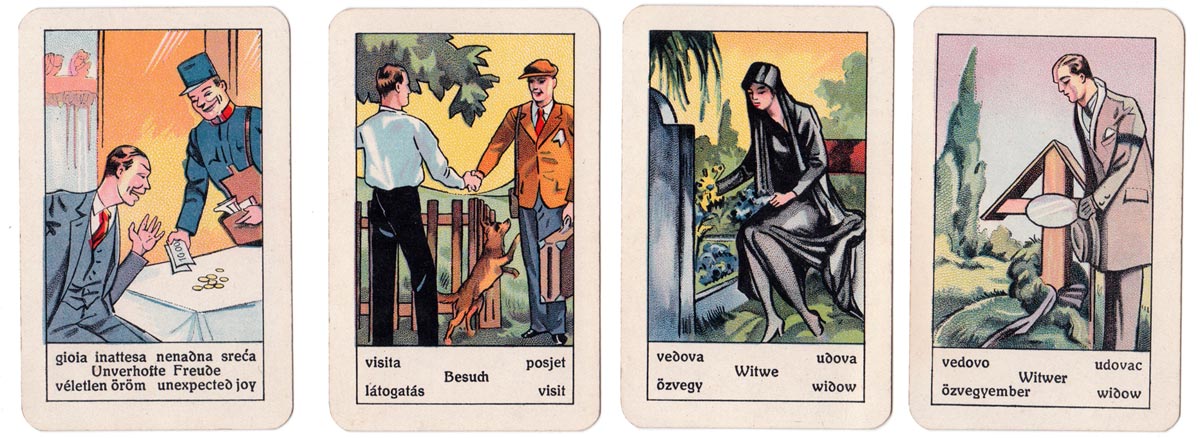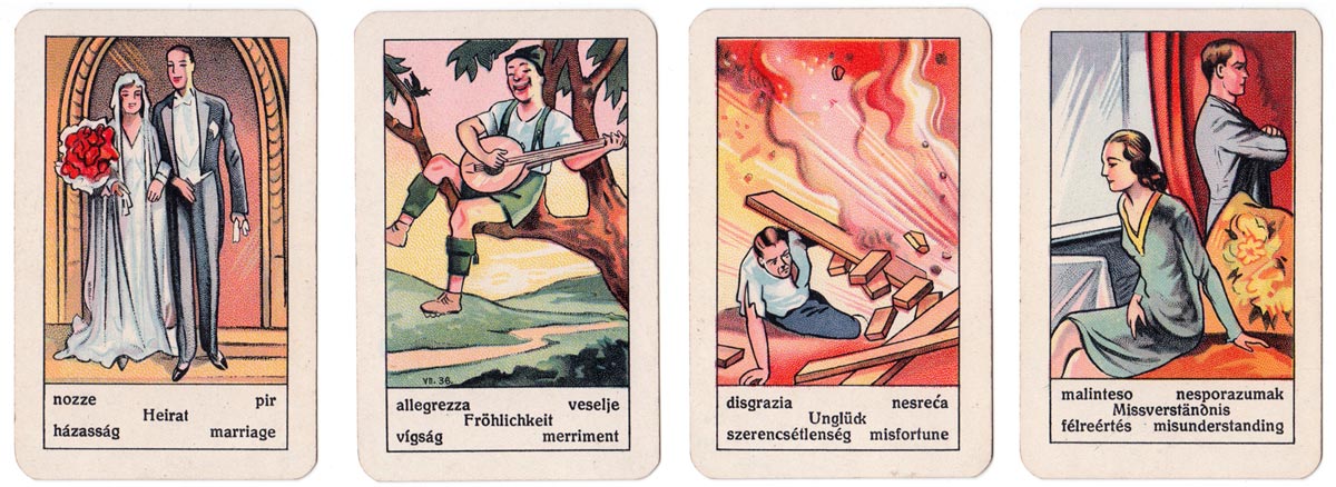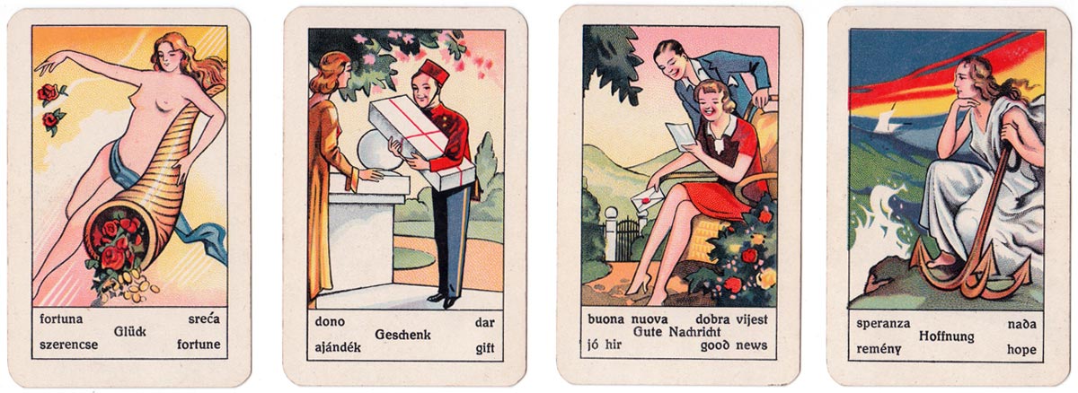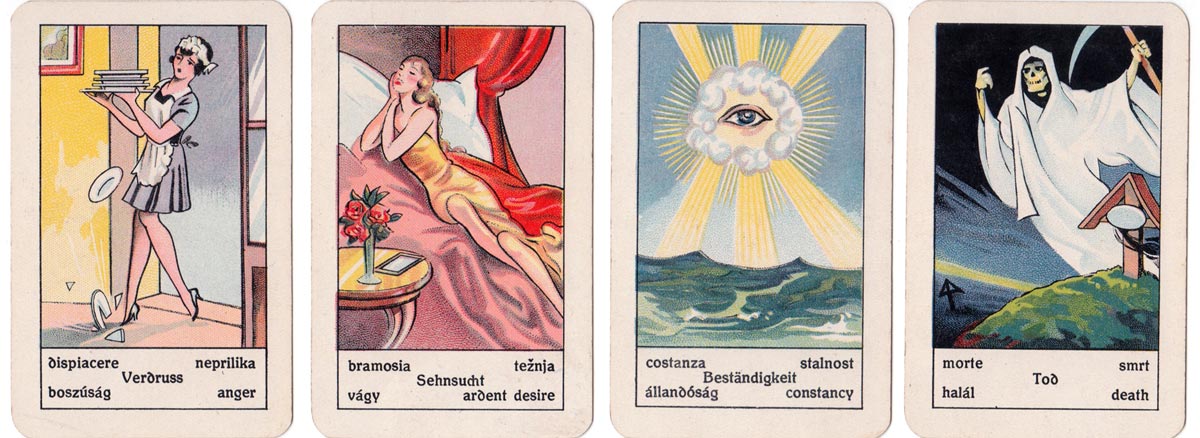 Above: Art Deco fortune telling deck with captions in five languages, published by Piatnik, dated 1936. 52 cards.
