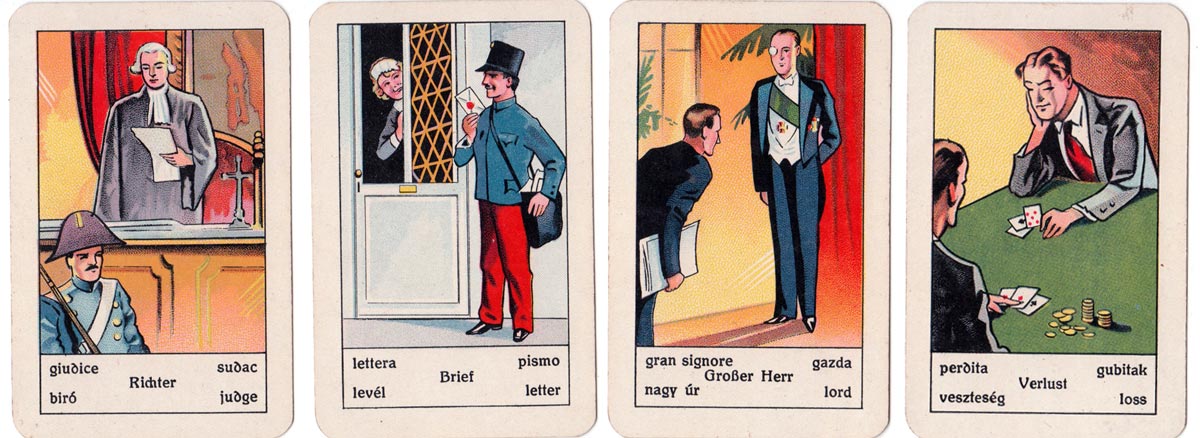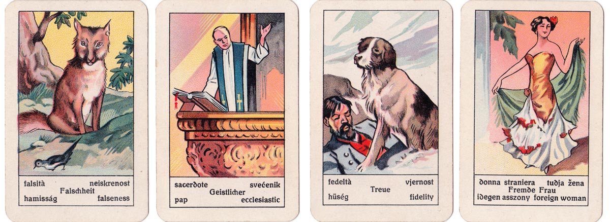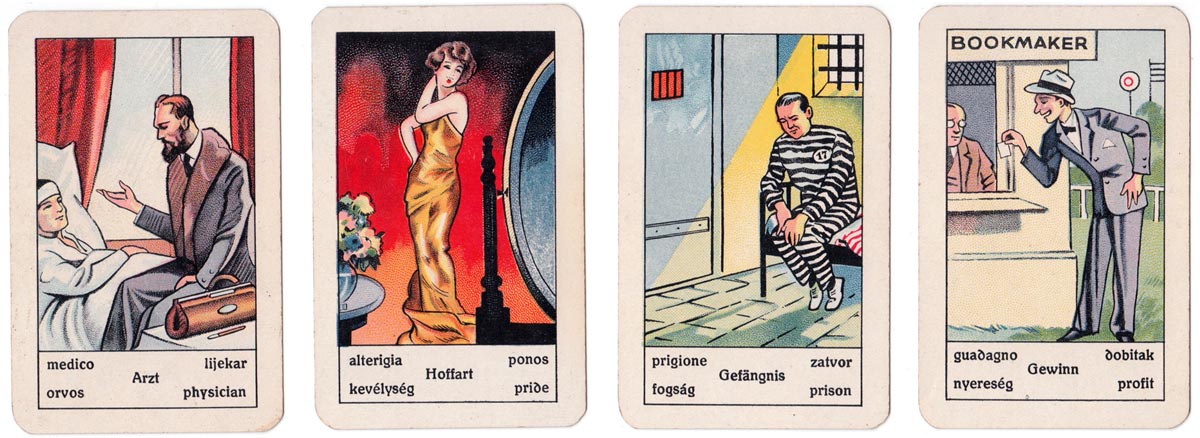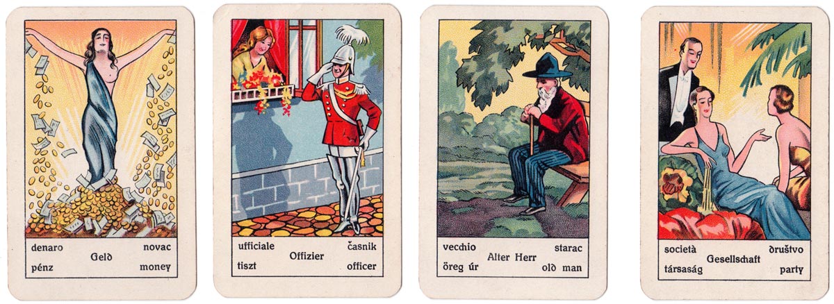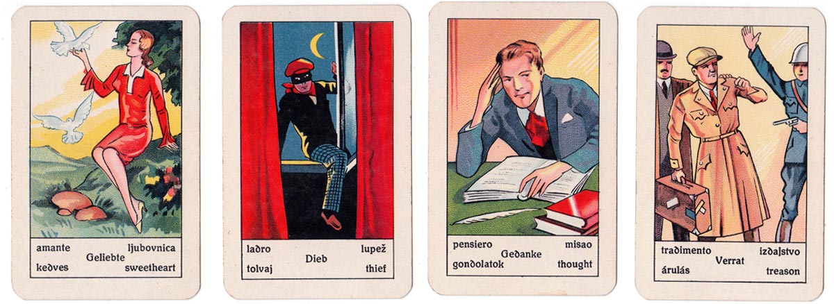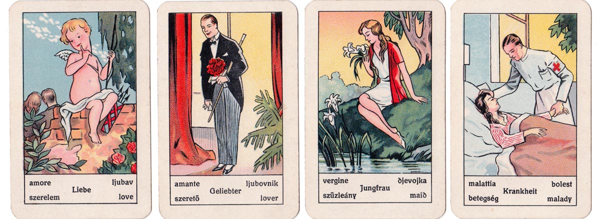 Above: Art Deco fortune telling deck with captions in five languages, published by Piatnik, dated 1936. 52 cards.