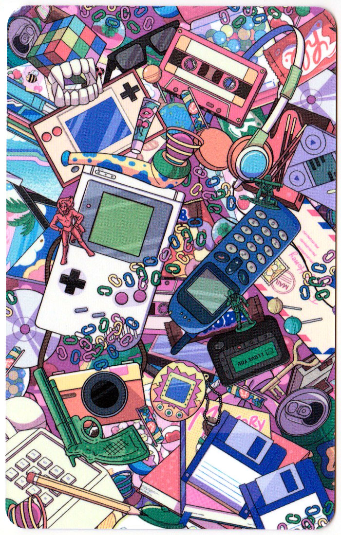 Above: the back showcases nostalgic 80s objects like GameBoys, floppy disks, CD ROMs, Tamagotchis, push-button telephones, and other products associated with that era. See the front and back of the box.