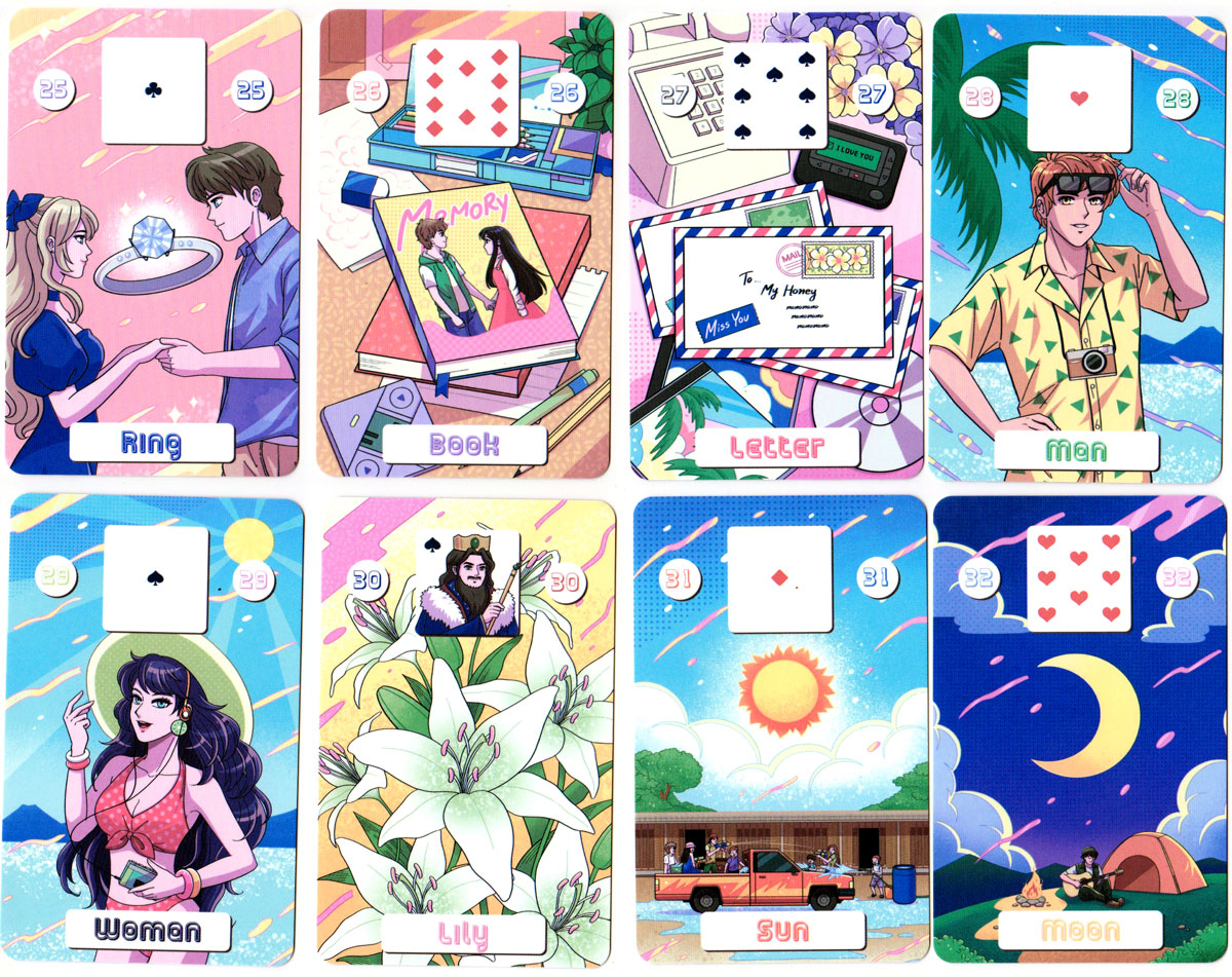 Back to the 80s Lenormand is a 36-card set, immersing itself in the vibrant aesthetics of 1980s Japanese-style comics and cartoons for girls. With a nostalgic nod to GameBoys, cassette tapes and Walkmans, each card portrays distinctive characters and scenes in a bright and colourful Japanese style.